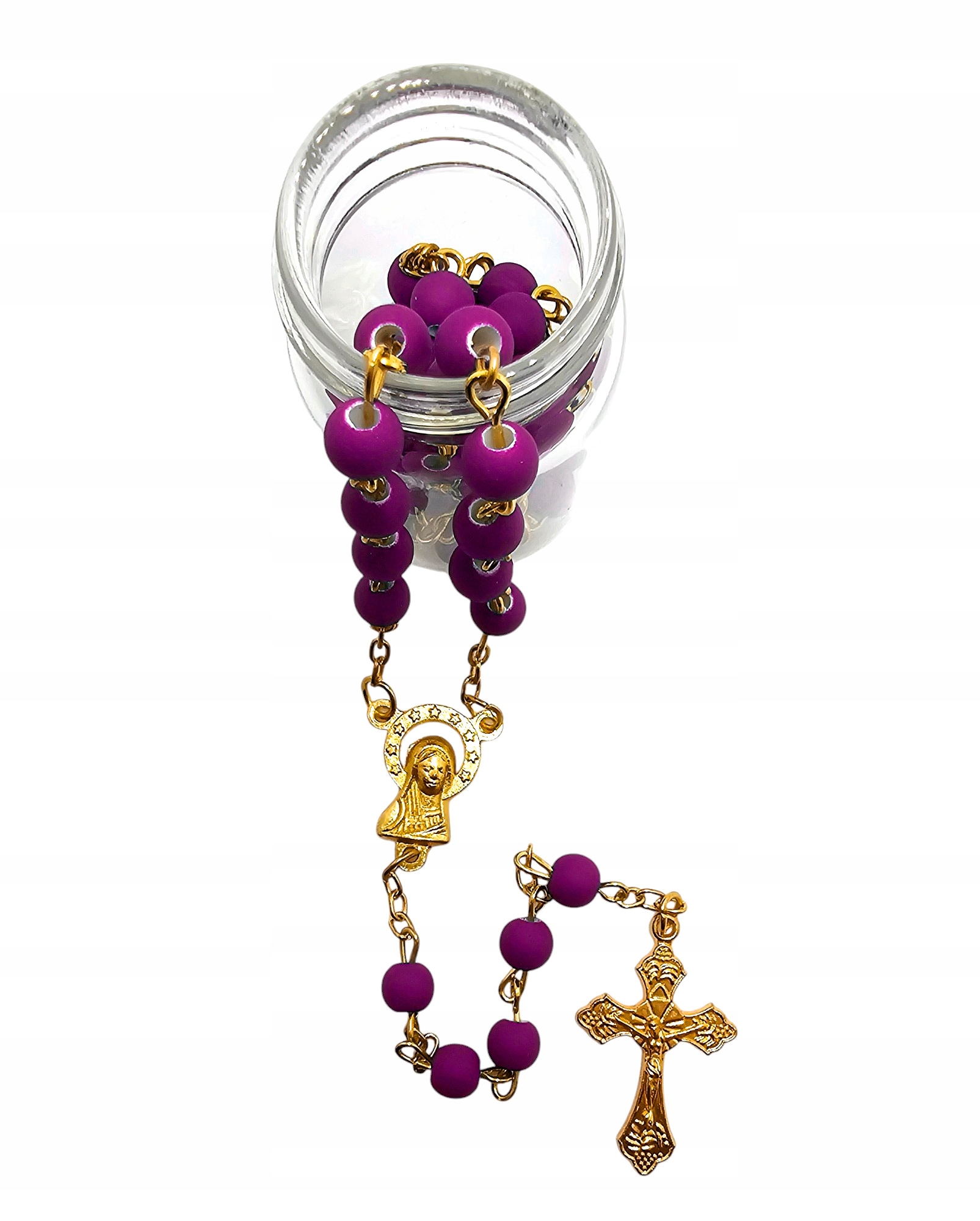 odkryj wyjątkowe poączenie piękna i elegancji w naszym fioletowym różańcu, umieszczzony w stylowym słoiczku Złotym wieczkiem. The whole looks extremely sophisticated and is an ideal idea for a luxurious gift. Różaniec Wykonany Jest Z Matowych, Fioletowych Koralików O Wielkości 6 мм, Które Cudownie Współgrają z delikatnym, Złotym ańcuszkiem. The rosary connector is the image of Mary, and the whole is crowned with a beautiful cross with dimensions of 28x18 mm. The length of the rosary is 49 cm. Słoiczek o Wysokości 5 см Dodaje Całości ekskluzywnego charakteru.
