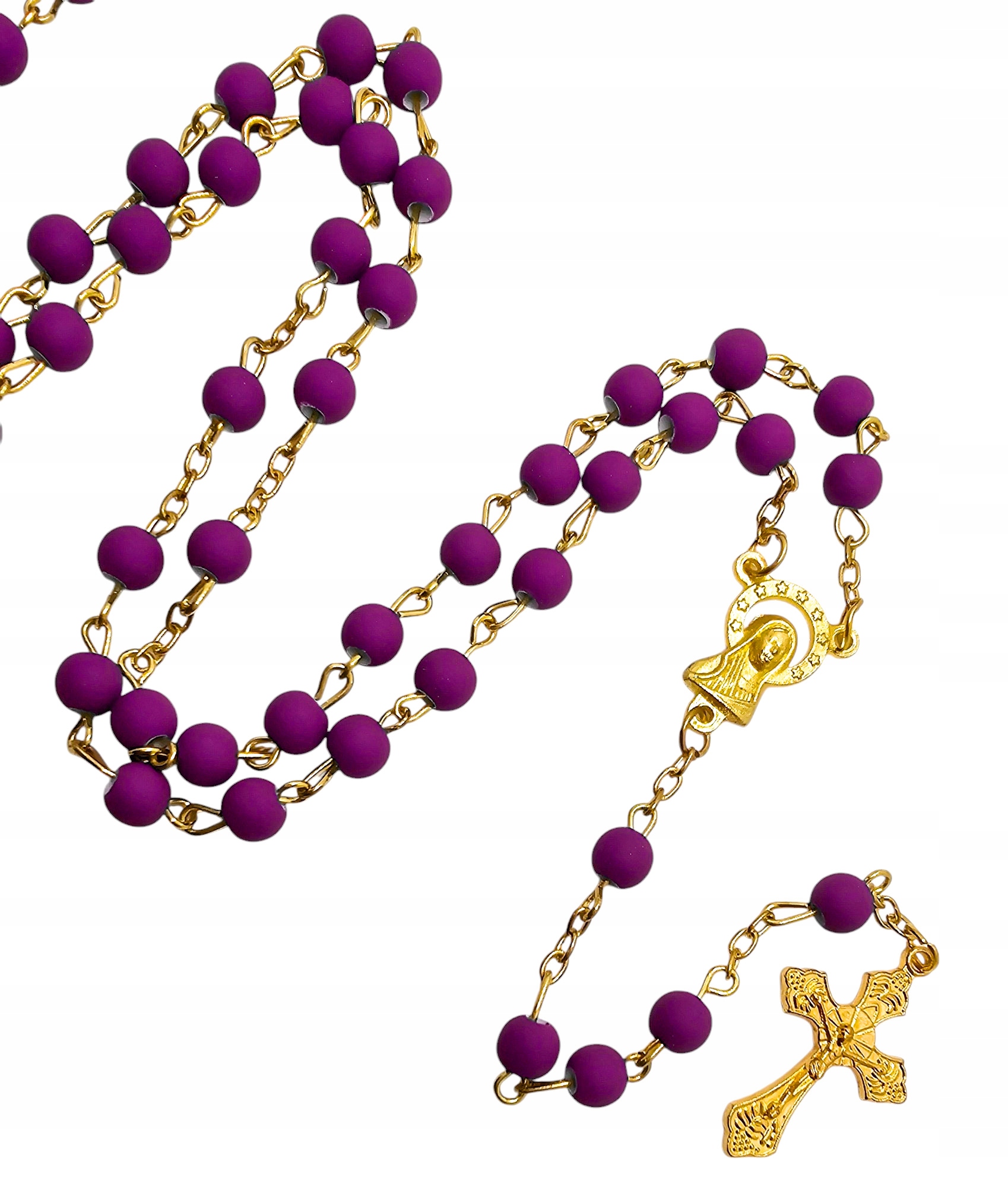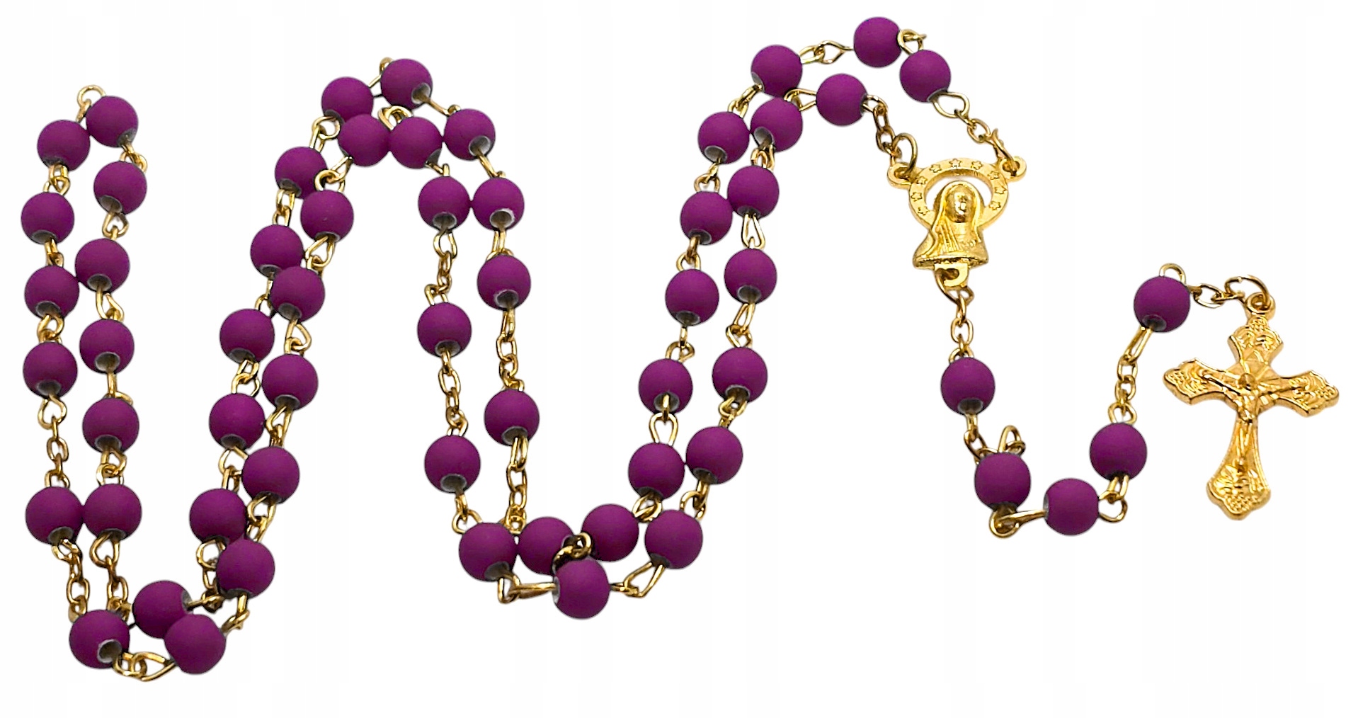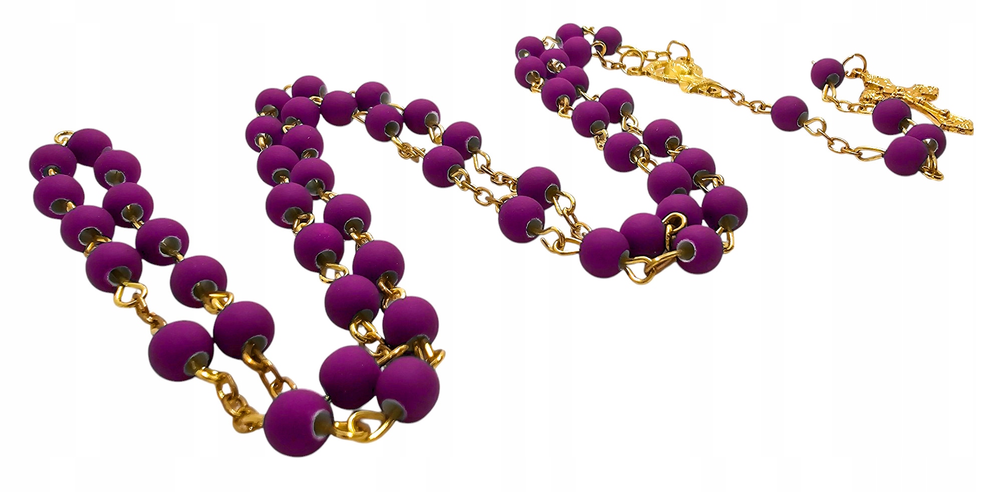 - materił różań: matowe, fioletowe łańcuszek, металл (Krzyż i cznik)