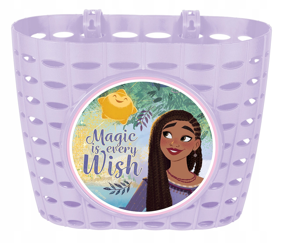 Корзина для руля состоит из красочного пластика и украшена наклейкой с любимыми персонажами из сказок. Это очень просто прикреплено к рулевому колесу с помощью ремня.