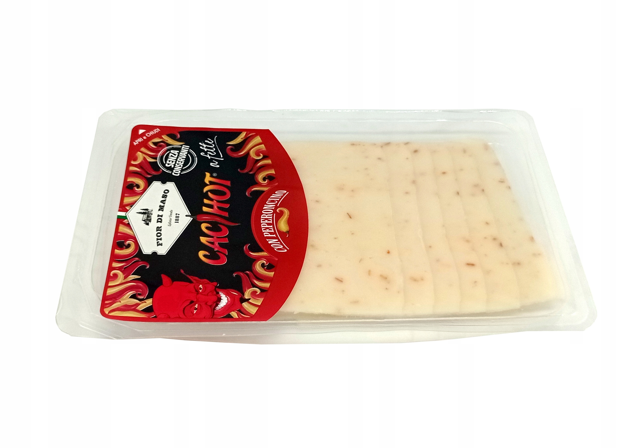 Fior di Maso Cachihot — сыр, приготовленный из коровьего и овечьего молока с добавлением острого перца чили. Неповторимый вкус сыра, обогащенный перцем чили, порадует каждого любителя пикантных вкусов.
