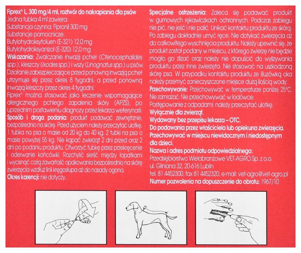 Продукты из линии Fiprex SPOT-ON можно применять щенкам старше 8 недель и/или весом более 2 кг. Фипрекс устойчив к воде и солнечному свету, однако животных нельзя купать за 2 дня до и 2 дня после введения препарата. Для достижения оптимального эффекта продукты следует применять с интервалом минимум 4 недели между последующими применениями. Всегда следует учитывать текущий уровень зараженности блохами и клещами на конкретной территории.