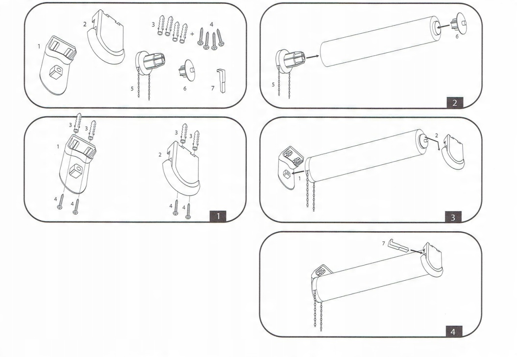 Ролетка крепится к потолку с помощью пластиковых ручек, в комплект входит рулонная штора, намотанная на алюминиевую трубу, ручки для крепления к потолку, система опускания с тормозом и цепочкой, а также крепежные штифты.