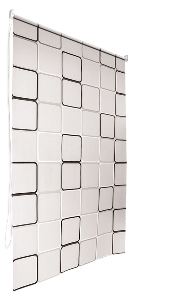 Ролетка крепится к потолку с помощью пластиковых ручек, в комплект входит рулонная штора, намотанная на алюминиевую трубу, ручки для крепления к потолку, система опускания с тормозом и цепочкой, а также крепежные штифты.