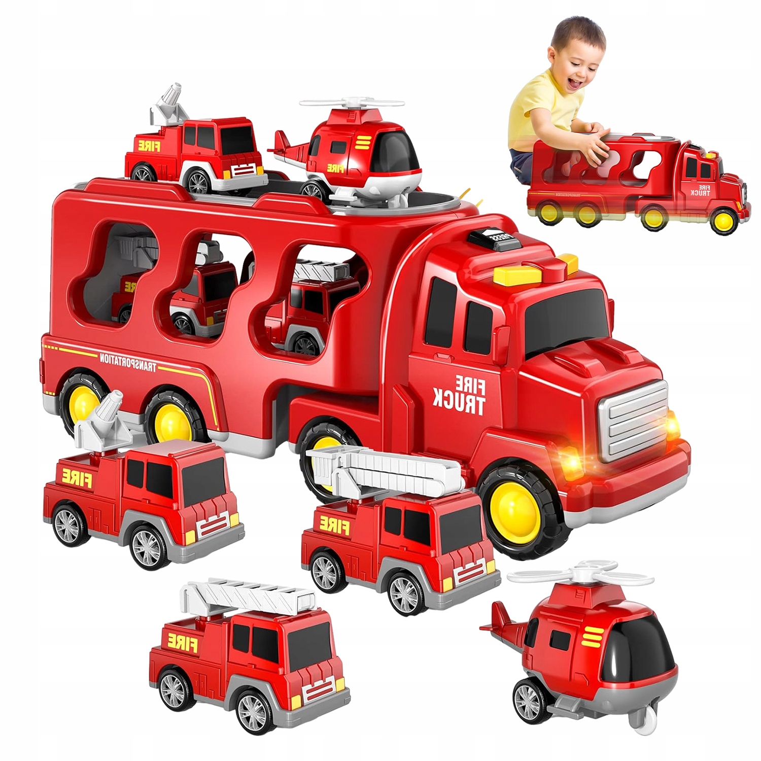 - 🚒 - 【ИГРУШКА-ГРУЗОВИК 7 В 1】 - Разработан для маленьких любителей пожарных, включает в себя транспортное средство большего размера и 6 небольших автомобилей (пожарная машина, автолестница, вертолет, поливочная машина, легковой автомобиль и внедорожник). Рабочую часть этих пожарных машин можно передвигать, благодаря чему ваш маленький герой почувствует, что спасательная операция проводится более игрушечно для мальчиков 3-5 лет.