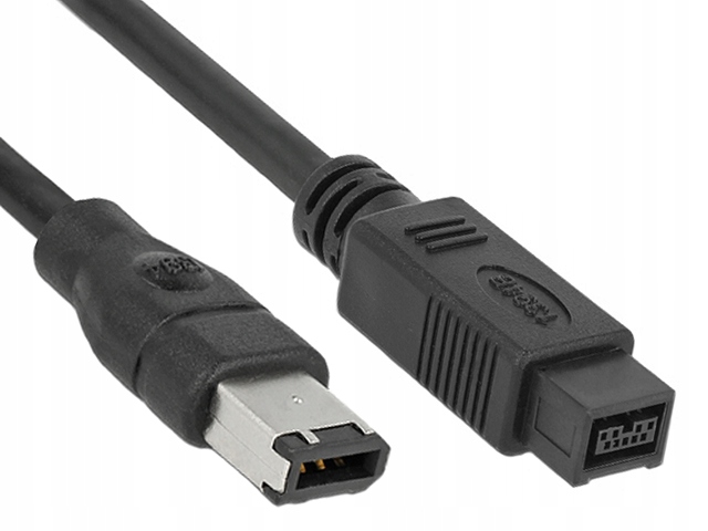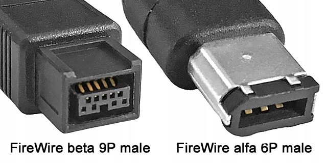 Предлагаемое подключение представляет собой кабель 9p-6p, имеет бета-штепсель 9p на одну, а Alfa 6p, с другой стороны, используется для отправки данных между оборудованием для оборудования порта Firewire 9p (например, Powerbook) и Firewire 6p (например, ПК с картой FireWire) и обеспечивает скорость передачи до 400MB/s.