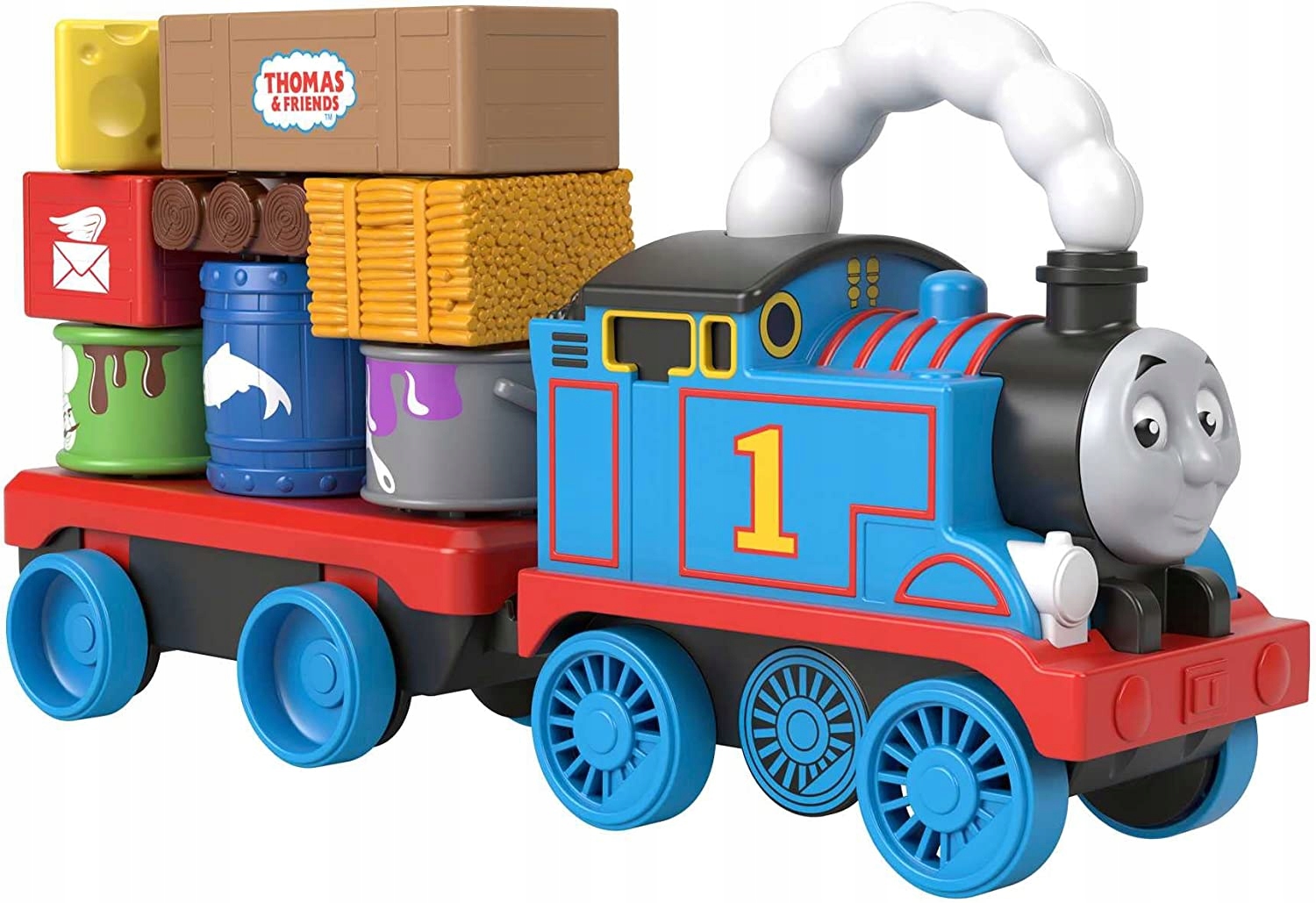 Большой паровоз Томаса с прикрепленной к нему грузовой машиной и шаткими штабелируемыми грузовыми частями Сверните Томаса, чтобы увидеть, как груз раскачивается вперед и назад. 8 грузовых элементов и штабелируемых блоков Ручка парового облака для захвата и переноски. Для малышей и гидов дошкольного возраста от 2 лет