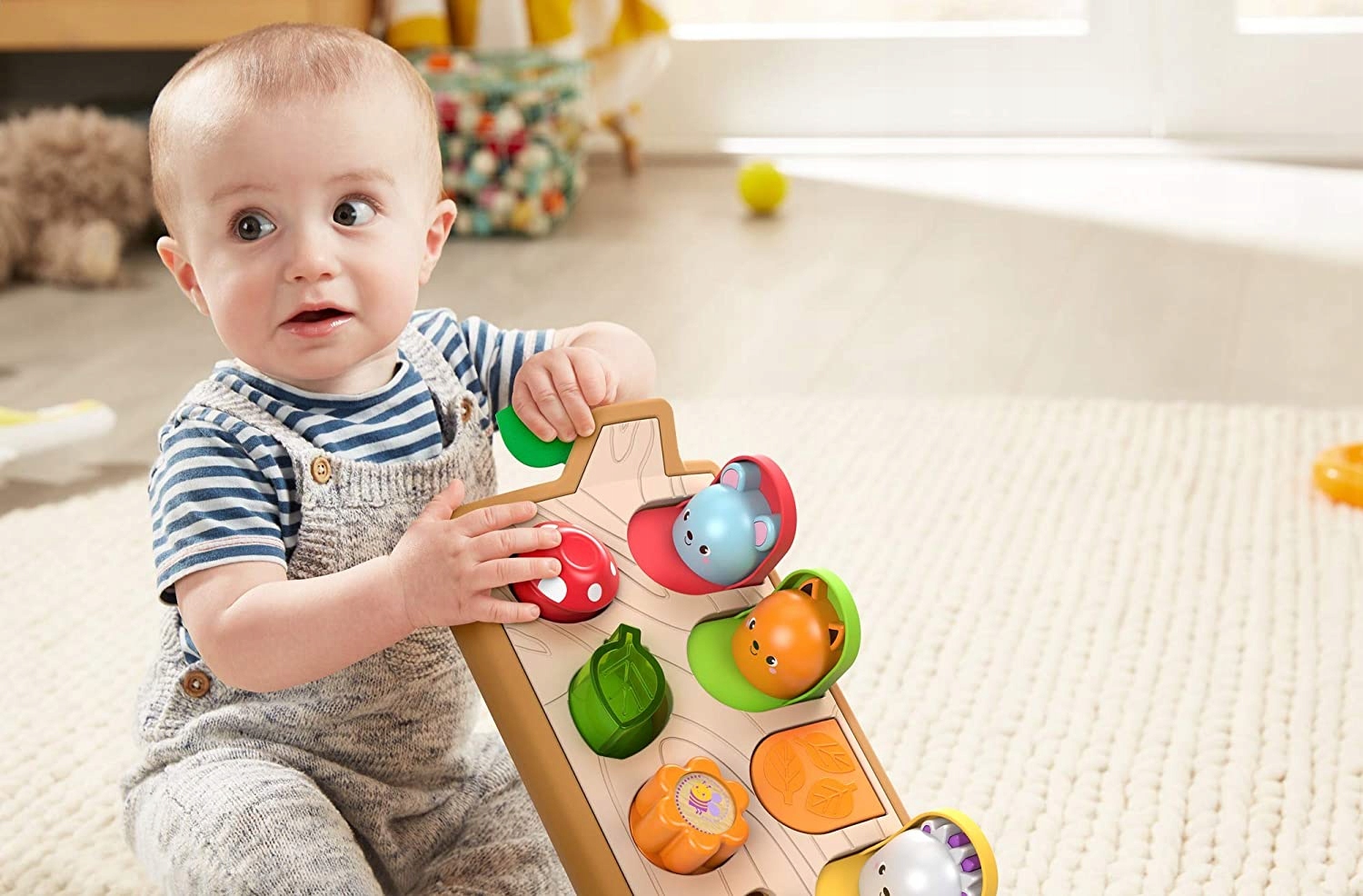 - Всплывающая игрушка-животное помогает малышам (старше 9 месяцев) развивать ловкость.