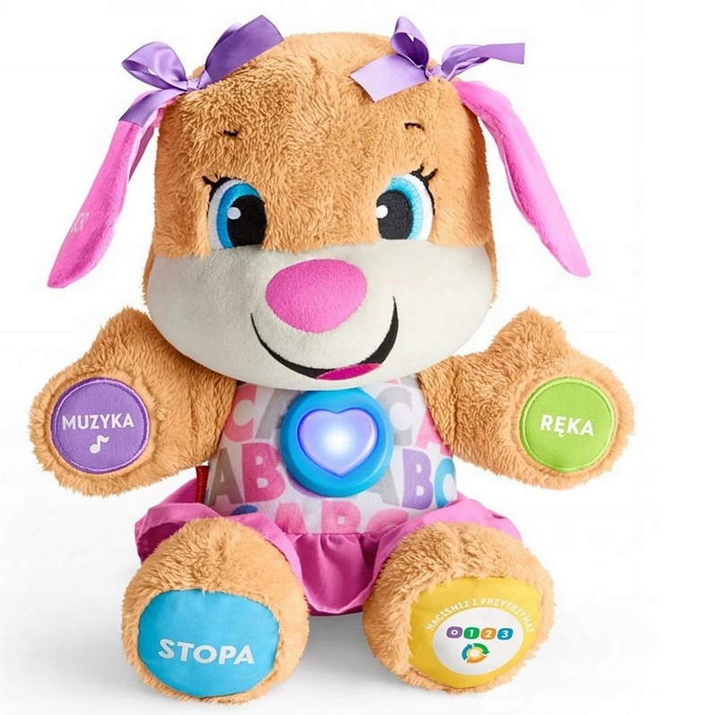 Пришло время познакомиться с прекрасной сестричкой Fisher Price Puppy Sister! Теперь очаровательная героиня выглядит еще прекраснее! Ее розовые уши украшены бантиками, а бело-розовое платье с буквенным мотивом очарует каждую девушку своим новым талисманом! Она идеальный товарищ по играм, друг-подушка, а также отличный учитель! Дети учатся быстрее, когда обучение доставляет удовольствие. Пойте и учите новые слова вместе со своей милой младшей сестрой.