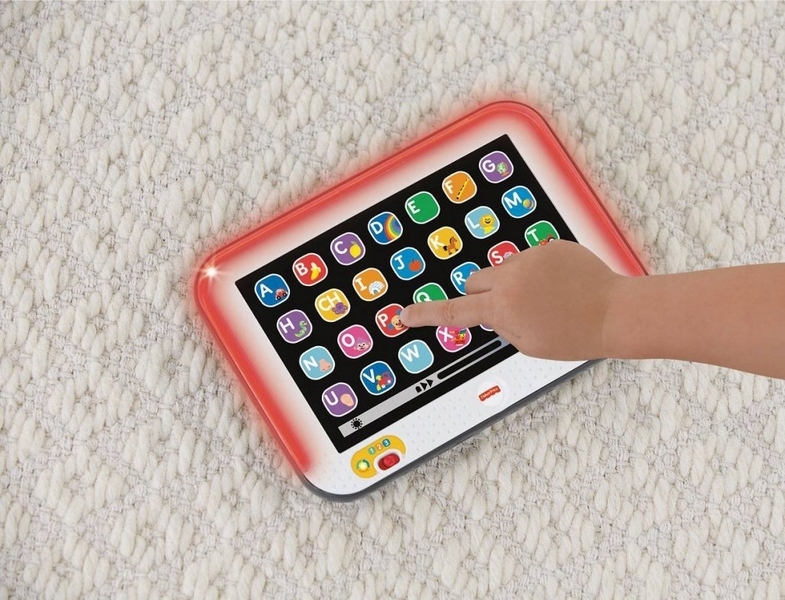 Рамка планшета загорается и мигает четырьмя разными цветами в ритме песни. Игрушка работает от 3х батареек ААА, которые входят в комплект. Подходит для детей от 12 до 36 месяцев.