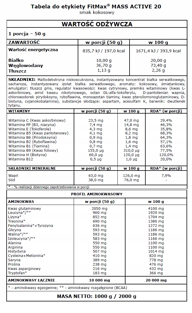 Пищевая добавка, поддерживающая рост чистой мышечной массы FitMax® MASS ACTIVE 20, включает в себя: