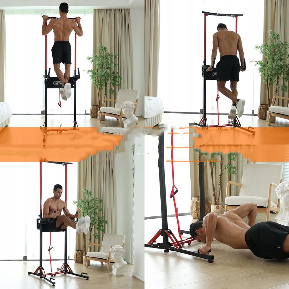 ONETWOFIT Power Tower имеет 9-ступенчатую регулировку высоты штанги в диапазоне от 127 см до 224 см, что позволяет настроить оборудование под рост пользователя и тип упражнений. Дополнительно подлокотники можно регулировать на двух уровнях – от 86 см до 105 см – обеспечивая комфорт и правильную осанку во время тренировки. Оборудование подходит для всей семьи, независимо от возраста и роста.