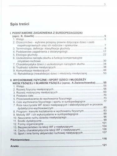 Описание: Книга издана Академией физического воспитания в г. Катовице и касается вопроса физического воспитания детей и подростков, глухих и слабослышащих. Он состоит из двух основных глав, посвященных основным вопросам сурдопедагогики и физического воспитания и спорта для глухих и слабослышащих детей и молодежи. В подразделах, среди прочего, описываются: Терминология, определения и классификации глухоты; Этиология глухоты; Школьные трудности для глухих; Физическое и двигательное развитие глухих; Задачи физического воспитания и спорта в сурдопедагогике; Обучение движению глухого ребенка; Безопасность на уроках физкультуры с глухими. Тираж книги: 250 экз.