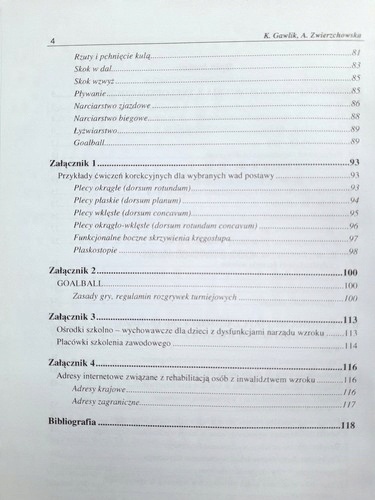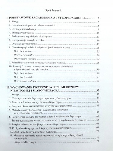 Описание: Книга издана Академией физического воспитания в г. Катовице и касается вопроса физического воспитания слепых и слабовидящих. Он состоит из двух основных глав, посвященных основным вопросам тифлопедагогики и физического воспитания слепых и слабовидящих детей и подростков. В подразделах описываются, среди прочего: этиология нарушений зрения, особенности детей с нарушениями зрения, физическое и двигательное развитие и осанка детей с нарушениями зрения, цели физического воспитания и спорта в тифлопедагогике. Кроме того, книга содержит, среди прочего, приложения
