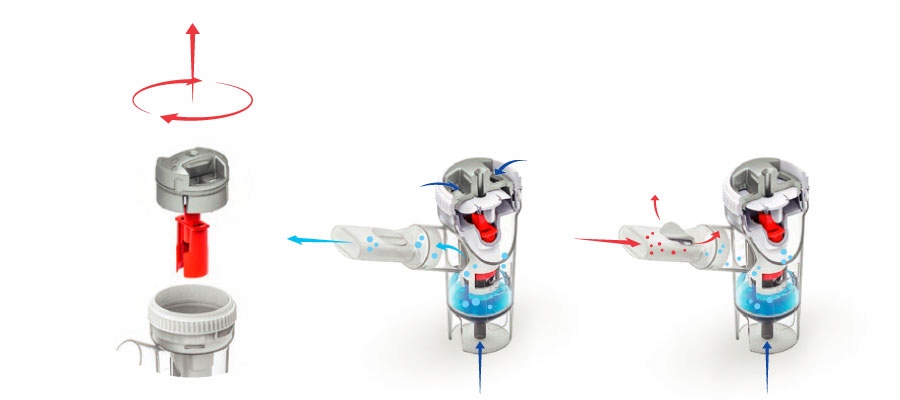 Система клапанов оптимизирует доставку лекарства пациенту и ограничивает его дисперсию. Небулайзер легко чистится, все элементы можно разобрать и промыть. Небулайзер позволяет легко менять размер частиц, поворачивая крышку RF9.