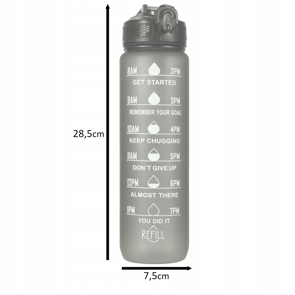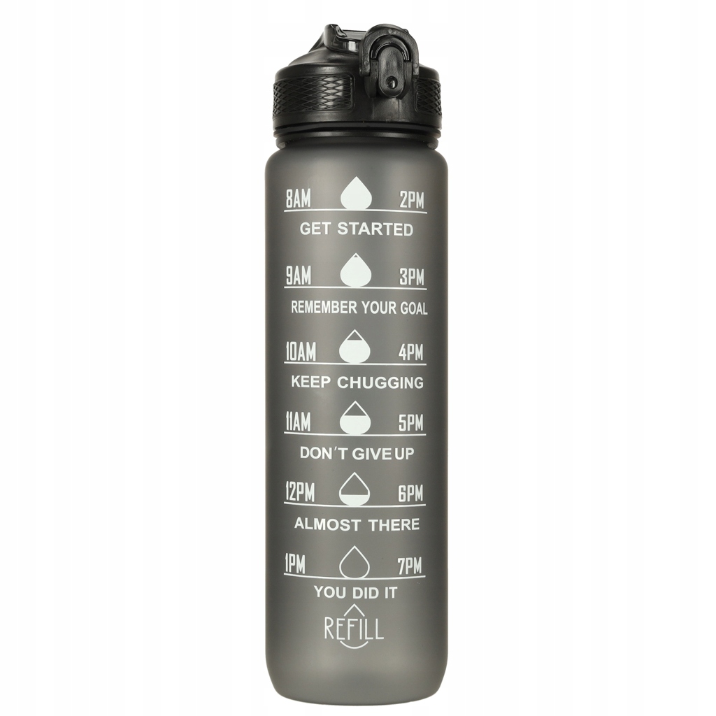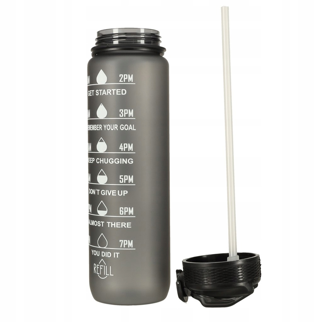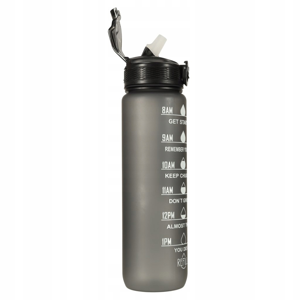 Бутылка для воды емкостью 1 литр — идеальный способ для отдыха увлажнение на весь день! Благодаря этому вы избавитесь от необходимости покупать одноразовые бутылки для воды. Бутылка оснащена практичным мундштуком с трубочкой, что делает питье из нее чрезвычайно удобным и не требует наклона. Кроме того, зажим защищает крышку бутылки от случайного открытия. Мерный стакан с часами и мотивационными надписями призывает вас регулярно пить воду. Изготовлен из прочного и пищевого тритана, не содержит BPA.