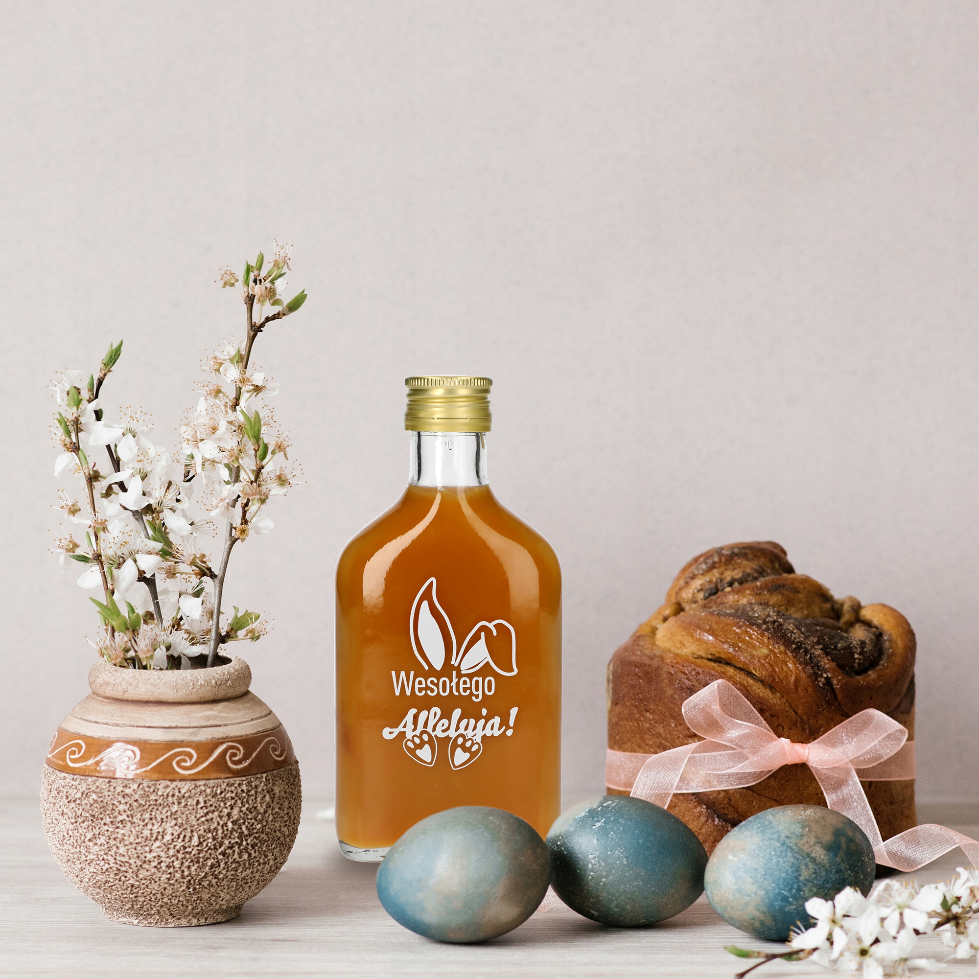 - Декоративна – благодаря элегантной форме с декоративным тиснением и привлекательным принтом с заячьими ушками и лапками и пожеланиями счастливого Аллилуйя! Эта бутылка красиво подчеркнет неповторимую атмосферу Пасхи.