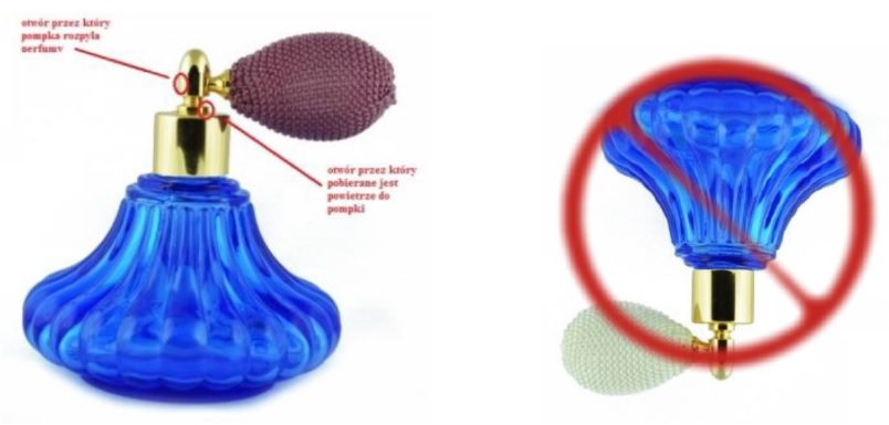 Каждый насос имеет в верхней части два отверстия – первое для распыления духов и второе для аэрации насоса. Именно через это второе отверстие есть риск разливания духов. Его цель — подать воздух к насосу и надуть его, чтобы можно было распылить туман повторно. Поэтому не следует транспортировать или перемещать флакон с насосом, если он не пуст и не лежит перпендикулярно земле. Также при использовании бутылки следите за тем, чтобы она не слишком сильно наклонялась. Так, в 99% случаев разливы духов происходят не в результате заводской течи помпы в местах, где должна соблюдаться ее герметичность, а при чрезмерном наклоне флакона или неправильном ношении (в сумочке, рюкзаке, багаже, машина и т. д.)