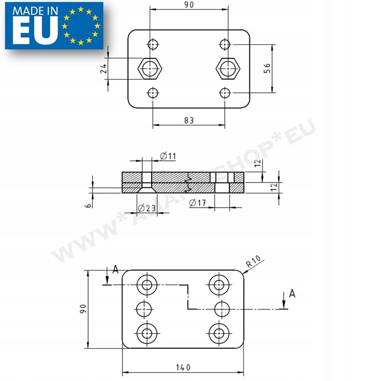 Адаптер используется для установки шара с расстоянием отверстий 90 мм в фаркоп, адаптированный к шару с расстоянием отверстий 83x56 мм, и наоборот.
