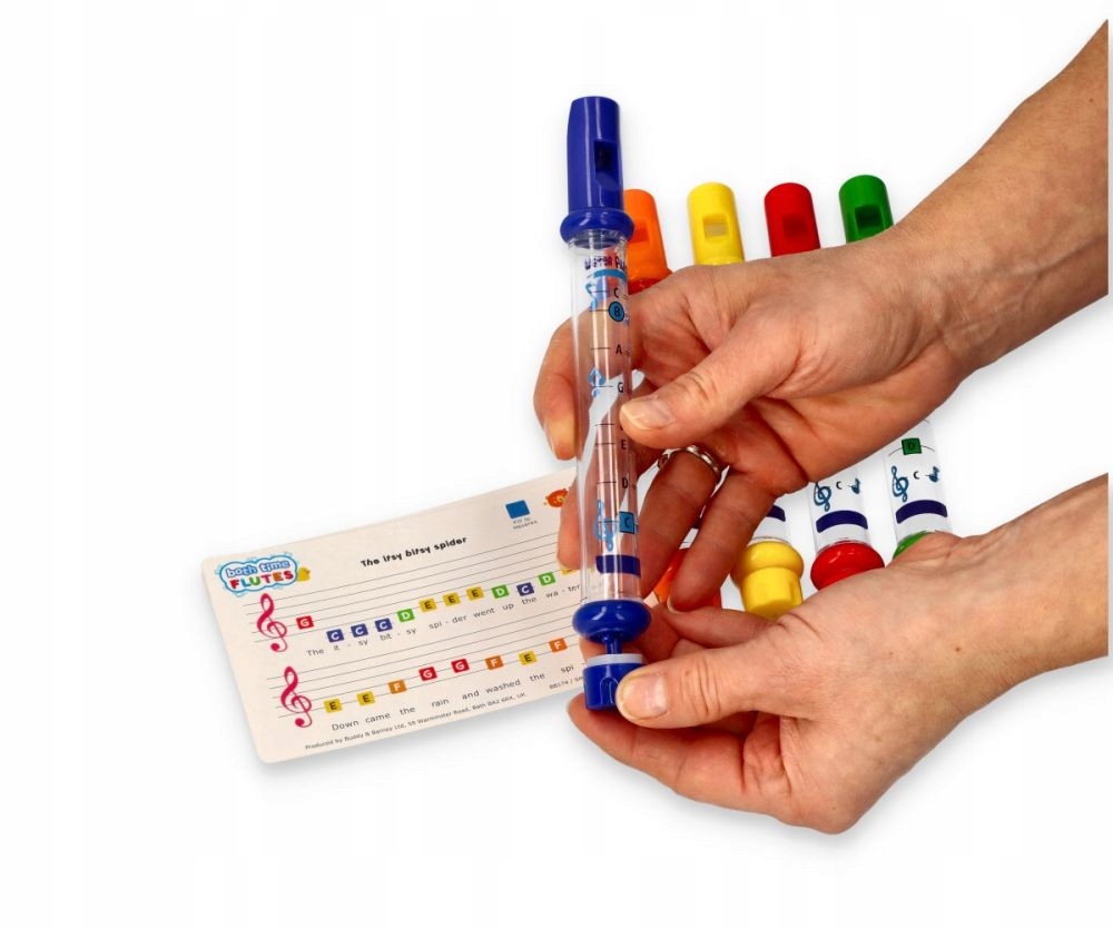 В комплект входят 5 флейт разных цветов и пенопласт с подходящими отверстиями. Дополнительно есть три двусторонние карточки с популярными детскими мелодиями.