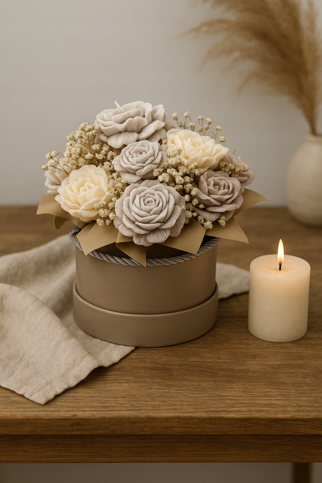 Букет выполнен в элегантнойцветочной коробке, выполненной из высококачественных цветов сои. Цветы выглядят настоящими, но в то же время их можно использовать как свечу, каминный воск или как уникальное украшение.