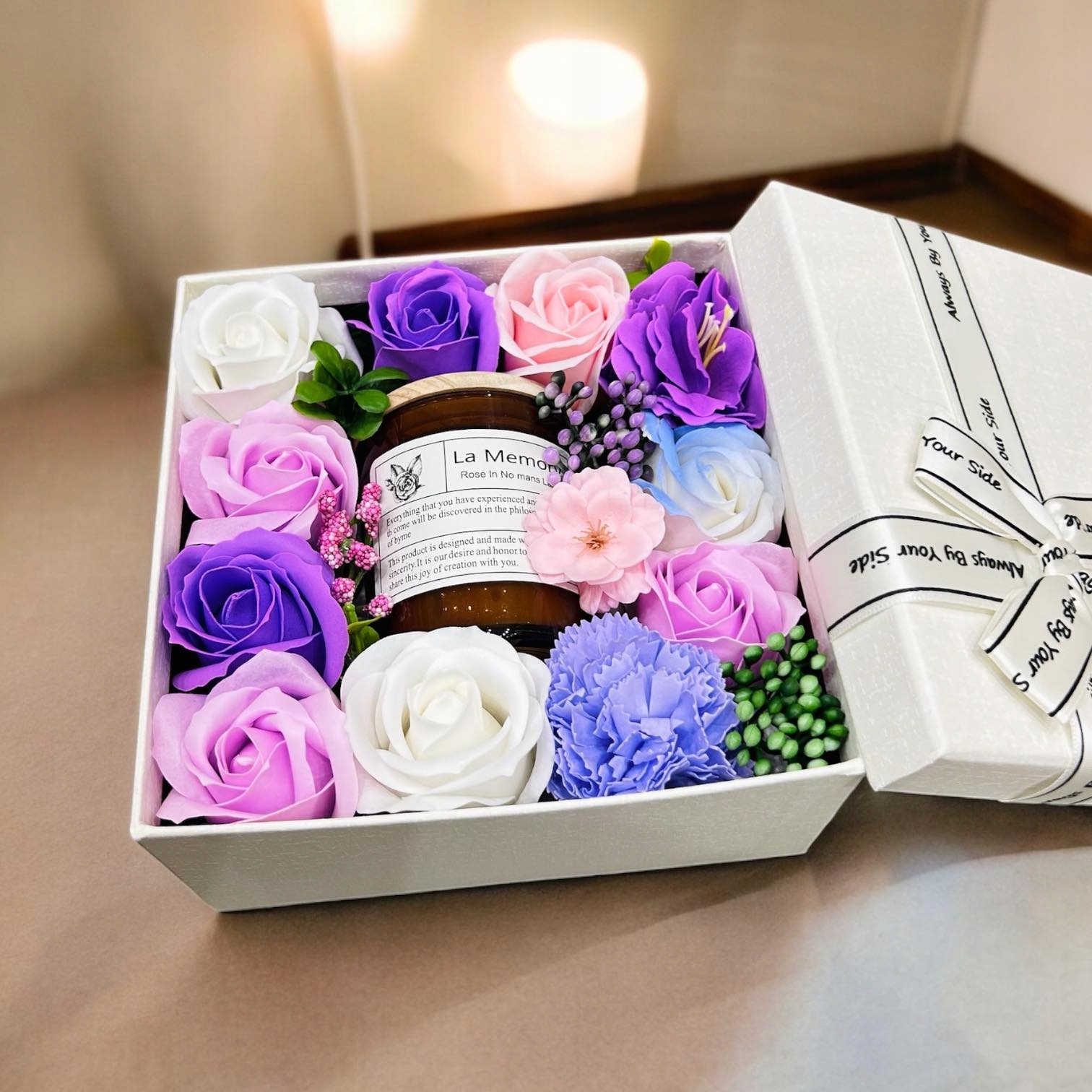 Цветочная коробочка с мыльными цветами и ароматической свечой – прекрасная идея подарка на любой случай!
