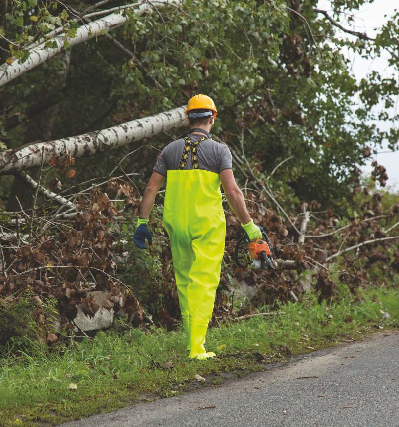 Модель изготовлена из водонепроницаемой, прочной ткани с флуоресцентным покрытием Plavitex Heavy Duty. Технология двусторонней сварки повышает прочность швов. Стелька с защитой от перфорации для работников, пробирающихся через мусор и подвергающихся риску проколов подошв. Носок повышает безопасность пальцев ног, снижая риск травм. Резинка регулирует размер по обхвату груди.