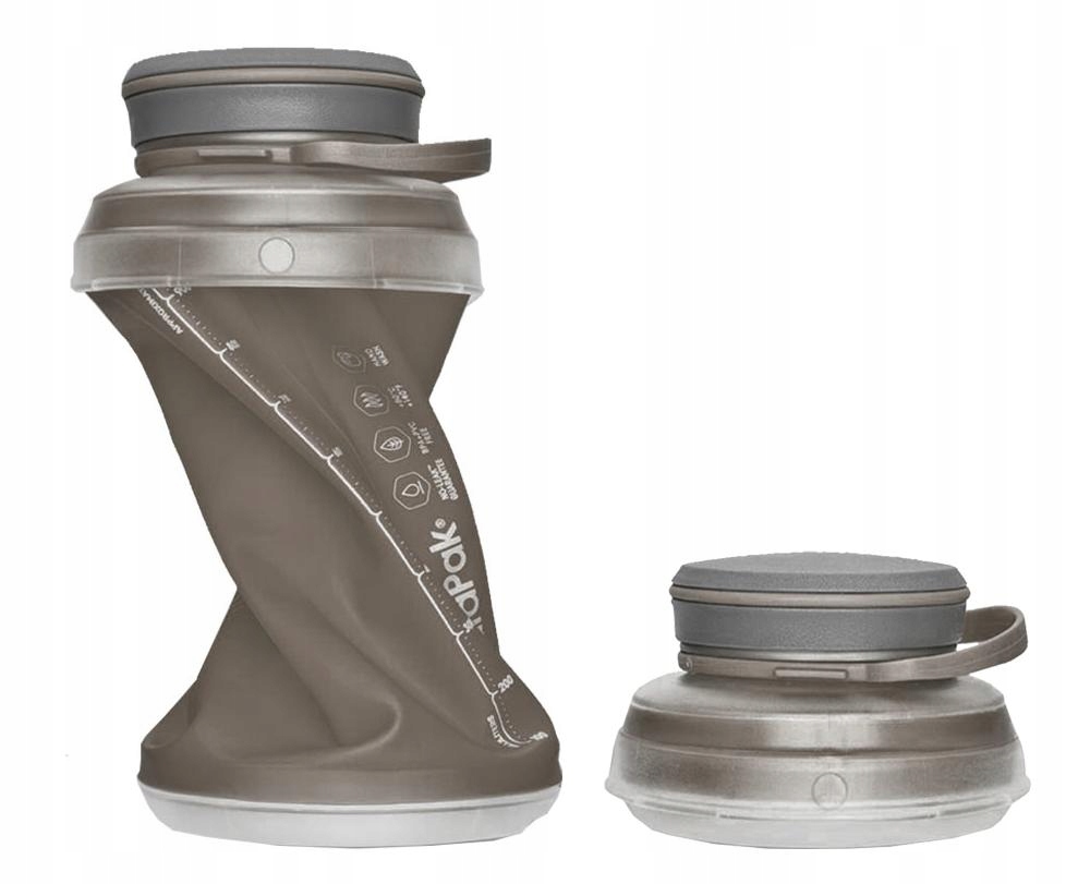 Сверхлегкая, складная бутылка, состоящая из трех соединенных между собой частей: гибкого композитного дна, мягких и очень прочных стенок и верхней крышки. с навинчивающейся крышкой диаметром 63 мм. Бутылка быстро и легко складывается, а в сложенном виде занимает очень мало места, что значительно облегчает ее транспортировку и хранение. Для изготовления стенок использовался очень прочный и устойчивый к истиранию, высоким и низким температурам ТПУ (термопластичный полиуретан) толщиной 0,4 мм. В сочетании с дном, верхом и крышкой из жесткого полиэтилена высокой плотности он создает почти неразрушимый контейнер. Соответствуя высоким стандартам ЕС и DFA при производстве, продукт не содержит токсичных химикатов BPA и ПВХ и обладает противогрибковыми свойствами. Гибкая конструкция легче стандартных жестких бутылок. Жесткая верхняя и нижняя часть обеспечивают устойчивость во время питья. Пробка имеет шероховатую текстуру, поэтому бутылку легче открывать мокрыми руками. Запатентованная верхняя крышка обеспечивает быстрое наполнение и плотное закрытие. Ручка из ПНД позволяет безопасно транспортировать бутылку. Его легко чистить и сушить. Отверстие шириной 63 мм обеспечивает удобное питье и быстрое и легкое наполнение. Диаметр отверстия позволяет использовать туристические фильтры с резьбой, благодаря которым мы можем использовать горные ручьи или лесные родники. Детали бутылки: