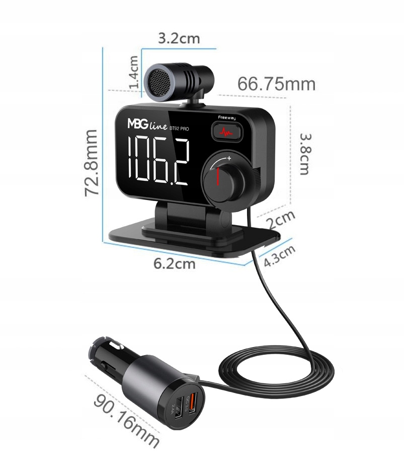 FM-передатчик + комплект громкой связи + вольтметр + сверхбыстрое зарядное устройство USB MBG LINE BT92 PRO