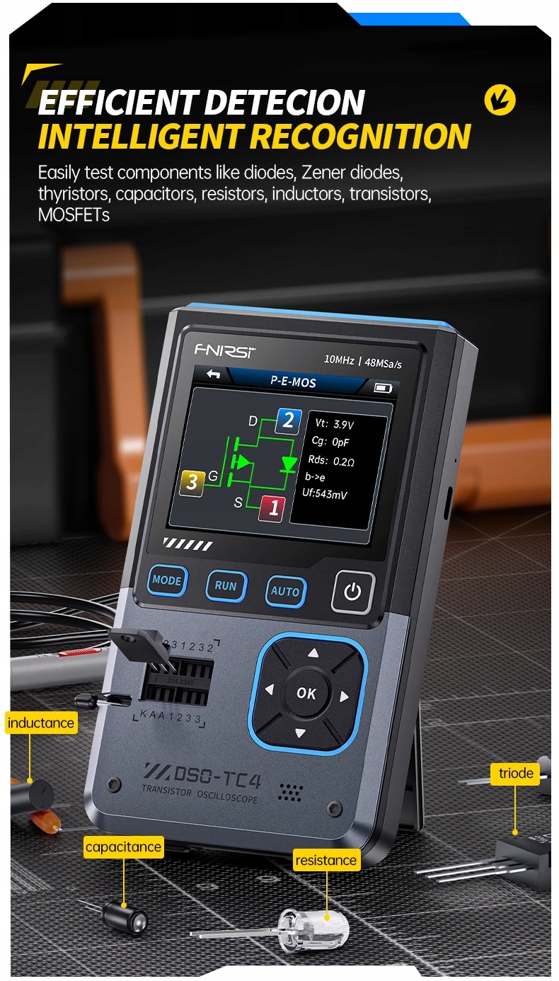 2025 Новый Fnirsi DSO-TC4 представляет собой многофункциональный осциллограф, интегрирует три основных функции: осциллограф, генератор сигналов и тестер электронных компонентов, предназначенные для технических специалистов по обслуживанию и специалистов по исследованиям и разработкам. Он соединяет осциллограф, генератор сигналов и электронные компоненты, включая возможность тестирования транзисторов в одном компьютере. Разработанный для точности как в местности, так и в лабораторной среде, ее многофункциональная архитектура улучшает диагноз схем, анализ курса проверки компонентов.