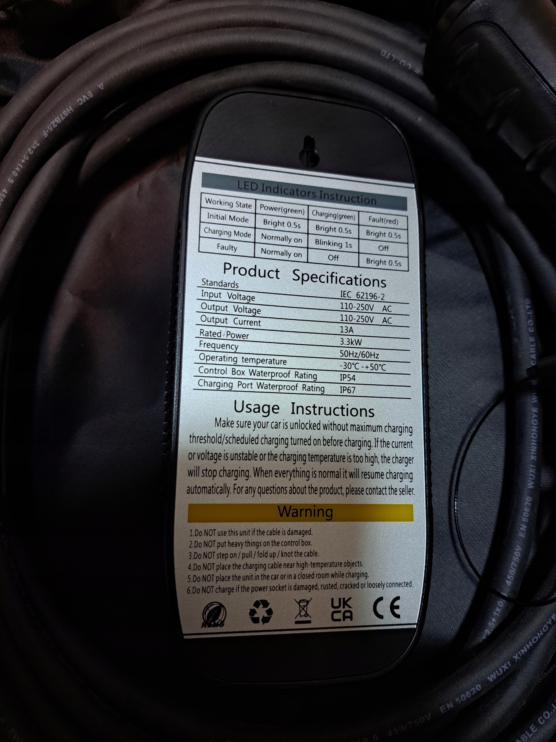 Уровень водонепроницаемости IP65 и рабочая температура от -25°C до +50°C обеспечивают бесперебойную работу в любых погодных условиях, будь то дождь или снег, в помещении или на улице. 3-контактная вилка для Великобритании означает, что вы можете легко заряжать свой электромобиль от любой стандартной розетки для Великобритании.