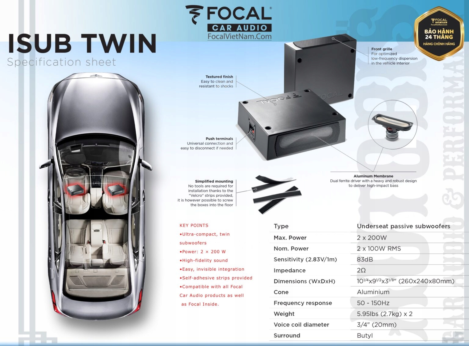 При разработке ISUB TWIN инженеры Focal сосредоточились на компактности без ущерба для высокой производительности. Сабвуферы высотой всего 3 1/8 дюйма (8 см) удобно помещаются под сиденьем.
