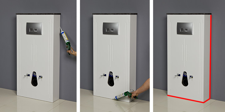 После сборки каркаса и его соединения надеваем конструкцию на каркас и крепим к стене с помощью верхней задней планки. Установите унитаз на винты и затяните их, чтобы стабилизировать всю конструкцию.