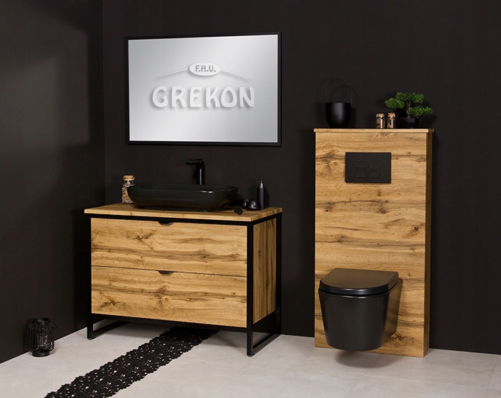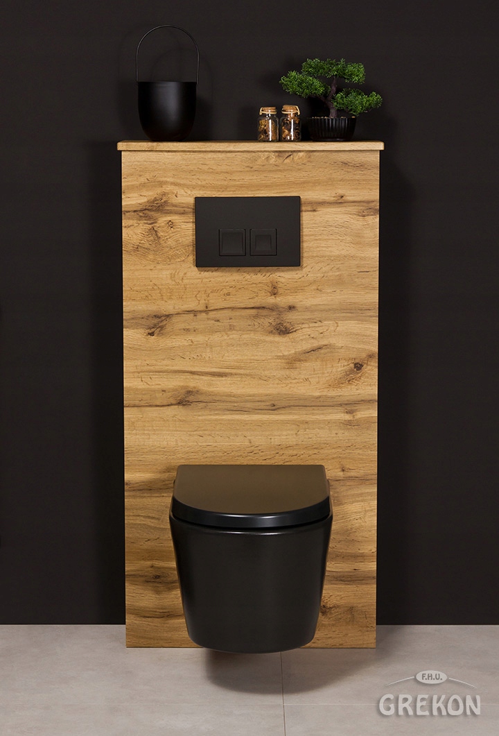 Готовый каркас унитаза цвета натурального дуба. Конструкция полностью изготовлена из фольгированной плиты МДФ. Каркас из этого предложения идеально сочетается со всей мебелью для ванной комнаты цвета натурального дуба.