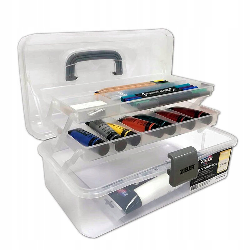 Прочный, легкий и вместительный, прозрачный бокс для необходимых аксессуаров – незаменимый элемент оборудования каждого художника. Имеет две складные полки с отделениями для красок, кистей, карандашей и мелков, ластиков и т. д. и свободное место внизу – для более крупных предметов. Благодаря этому все аксессуары организованы, видны и легко доступны. Коробка имеет прочную застежку и удобную ручку. Размеры: ширина 33 см, глубина 20 см, высота 15 см.