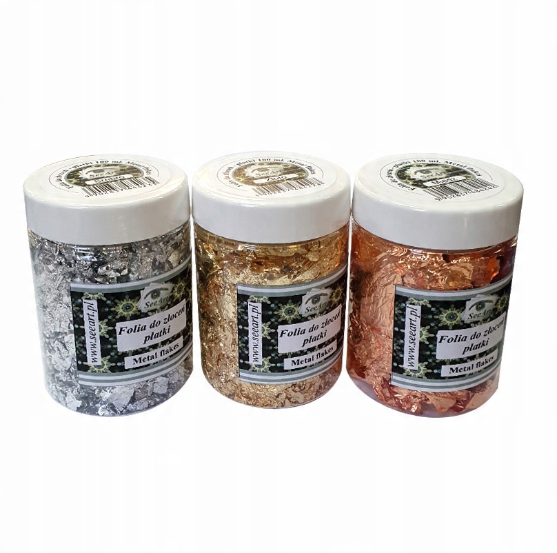 Очень тонкие хлопья фольги, используемые для золочения поверхностей. Для приклеивания лепестков используем клей для позолоты, который после высыхания становится самоклеящимся и только после этого можно наносить фольгу (излишки следует убрать кистью). Для сохранения блеска рекомендуем использовать для отделки лак. Цвета фольги можно смешивать.
