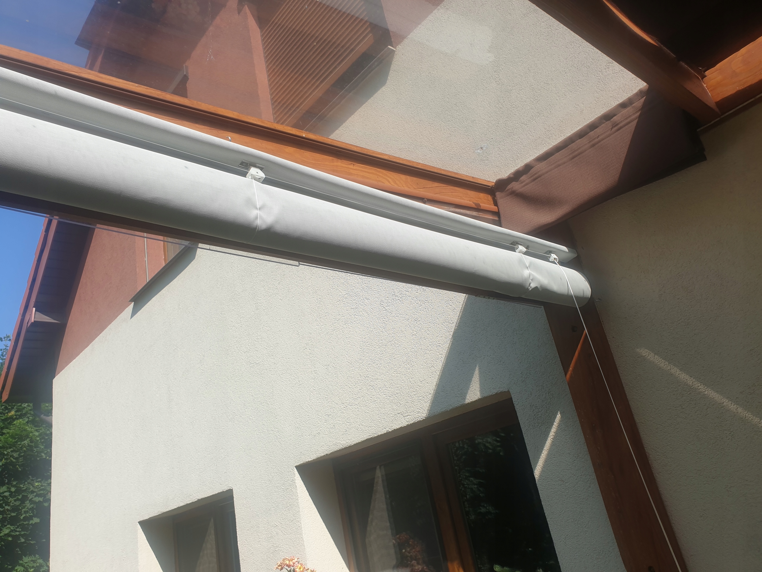 Свободновисящие рулонные шторы из ПВХ-пленки в сочетании с сеткой. Ролеты крепятся на деревянную планку с помощью винтов-бабочек и дополнительно оснащаются струнным механизмом. В состав механизма входят люверсы, направляющие тетиву, и запорный механизм.