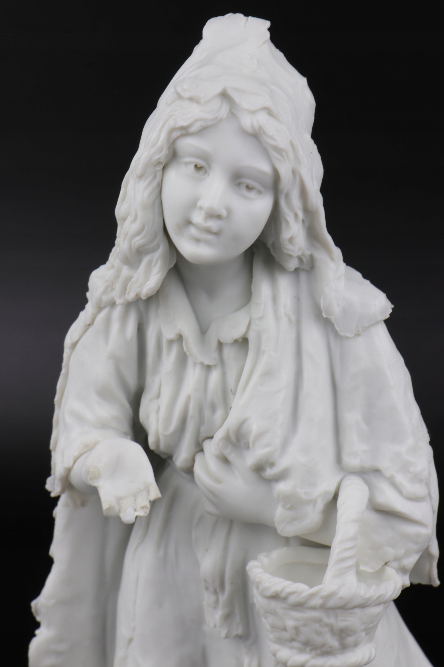 Фарфоровая бисквитная фигурка молодой нищенки, подписанная маркой Volkstedt Richart Eckert Thuringia. Фигурка из бисквита очень тщательно и точно смоделирована, с прекрасно детализированными деталями лица женщины и рваной одежды. Кобальтово-синяя подпись внизу основания фигурки. Коллекционный фарфор.