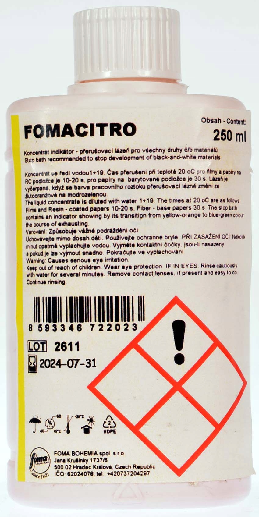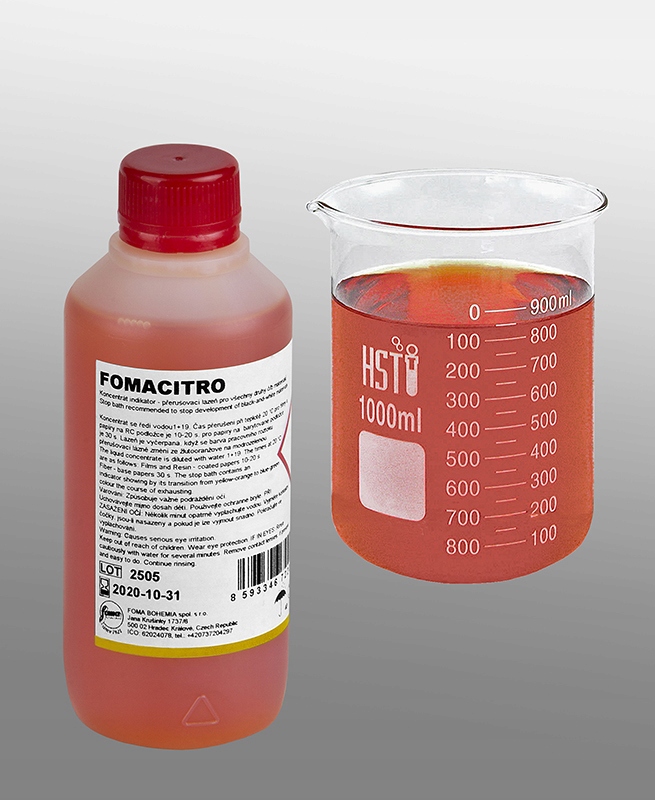 Fomacitro-это концентрированная ванна перерыва, основанная на лимонной кислоте, идеально подходящей как для любителей, так и для профессионалов, занимающихся обработкой негативов и фотографических документов. Продукт отличается полным отсутствием запаха, что делает его дружелюбным для пользователей в разных условиях.