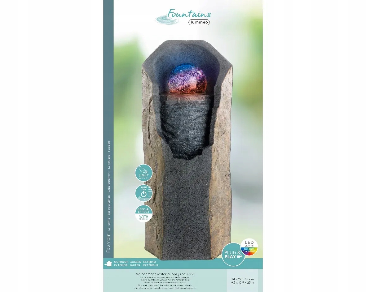 Визуально фонтан выглядит так, словно сделан из настоящего камня – а благодаря светодиодному освещению получается нечто уникальное и эффект гораздо более эффектный.