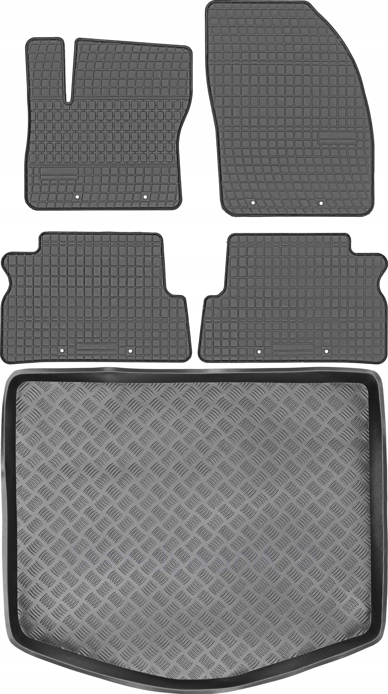 Комплект, созданный компанией MAX-DYWANIK®, состоящий из резиновых ковриков польской компании PRISMAT вместе с ковриком в багажник из пластика польской компании MIX-PLAST.