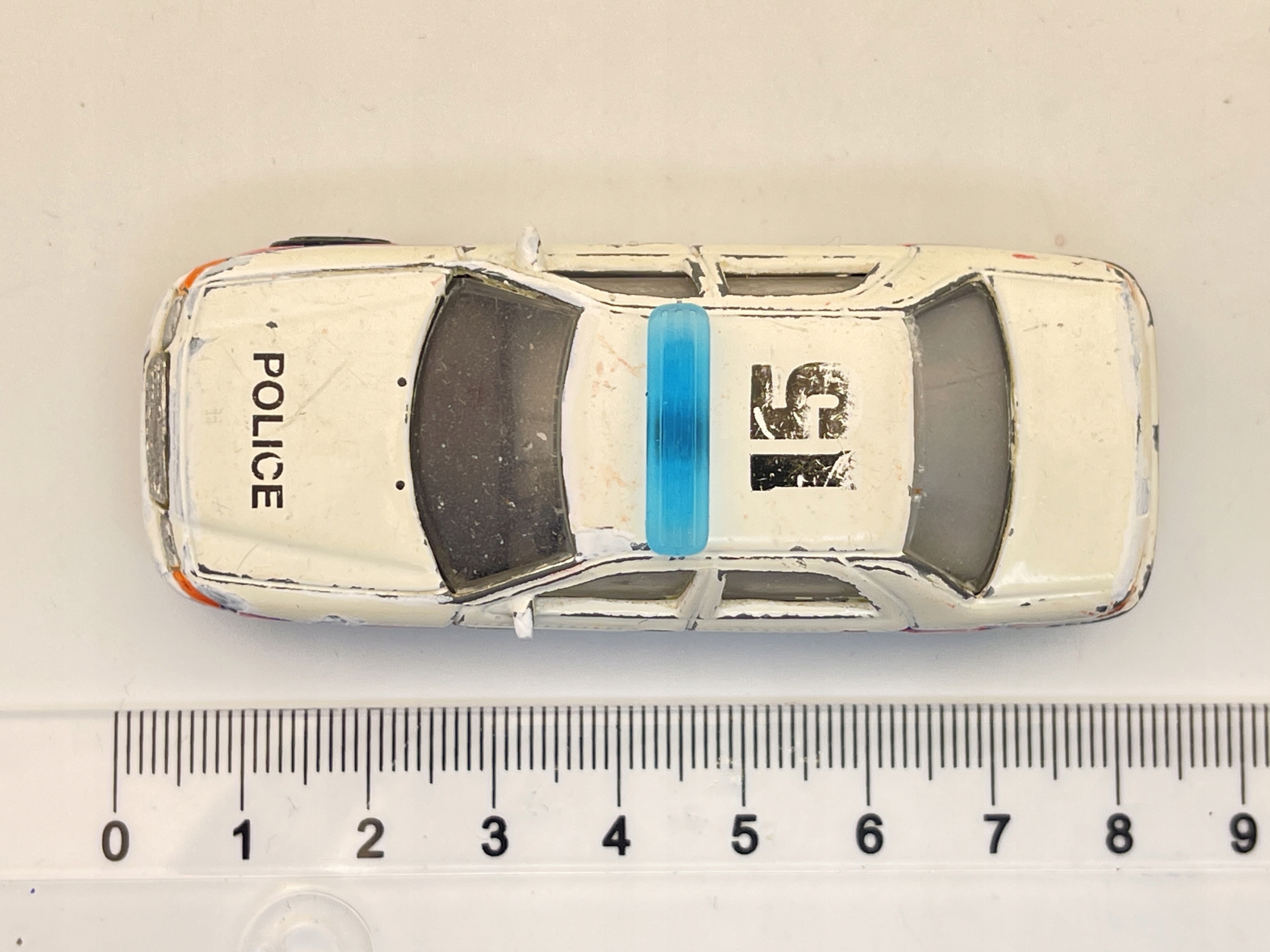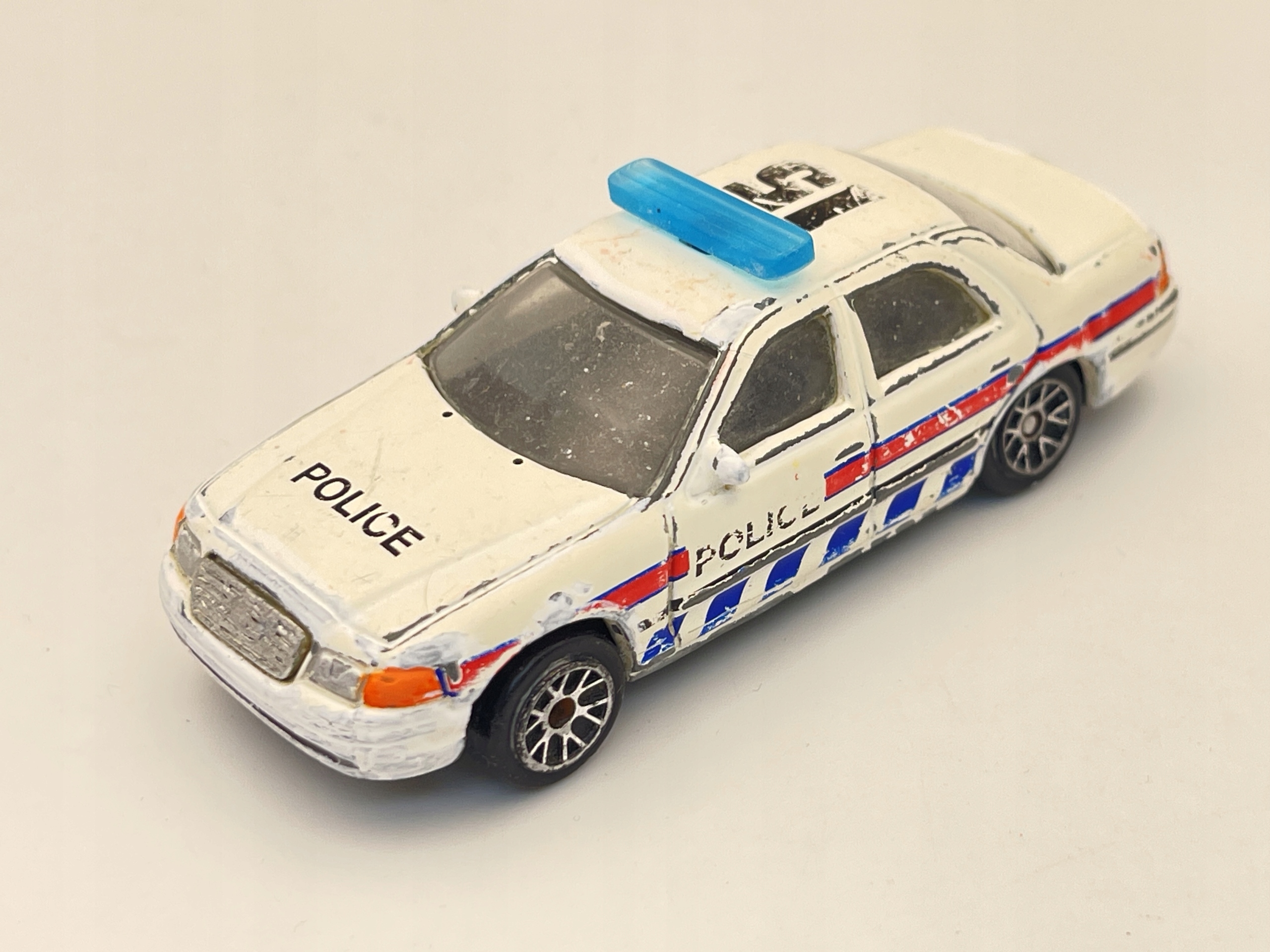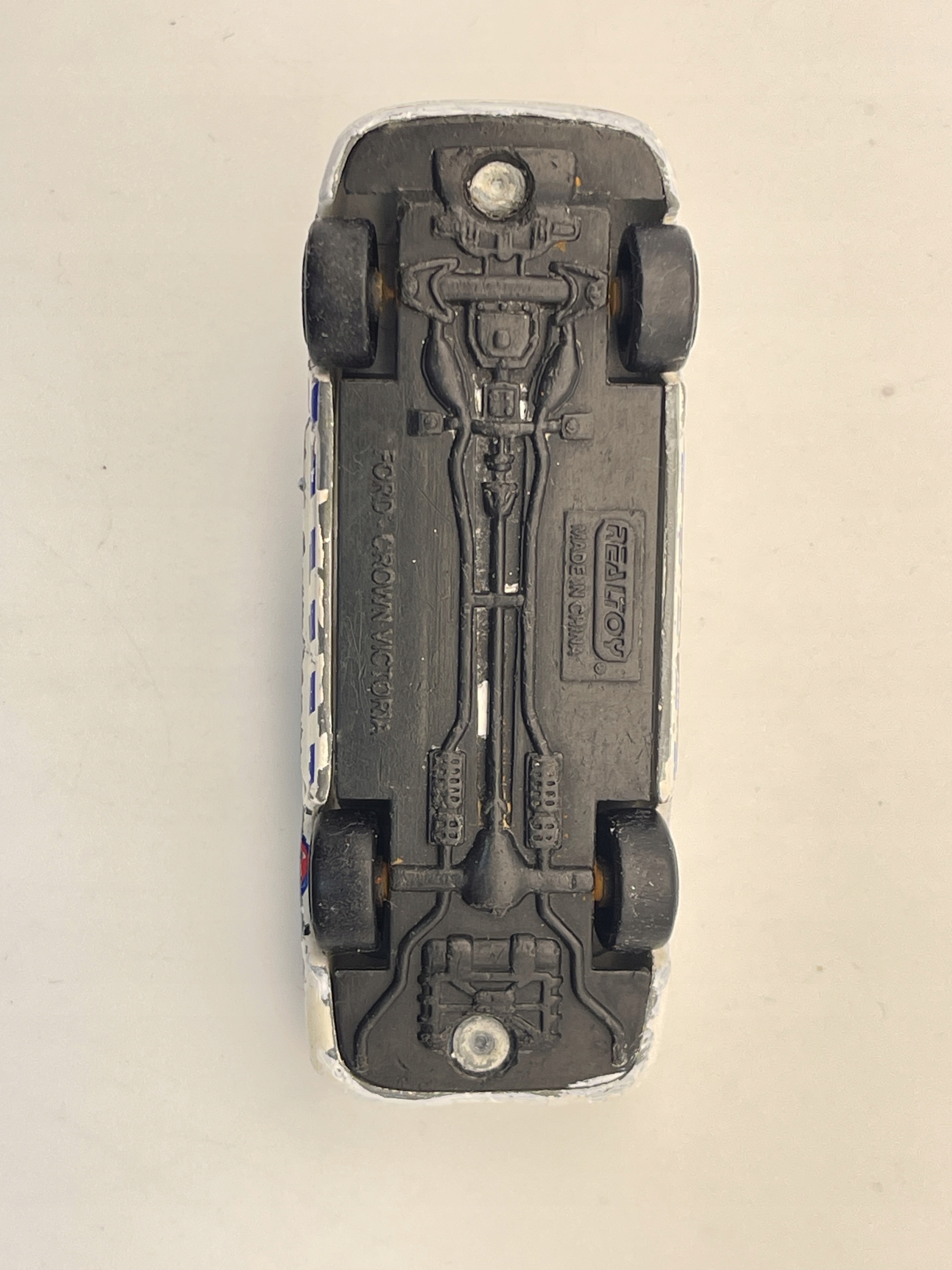 Этот автомобиль представляет собой полицейскую машину Ford Crown Victoria от Realtoy, отличающуюся бело-сине-красной окраской и характерным синим петухом на крыше.