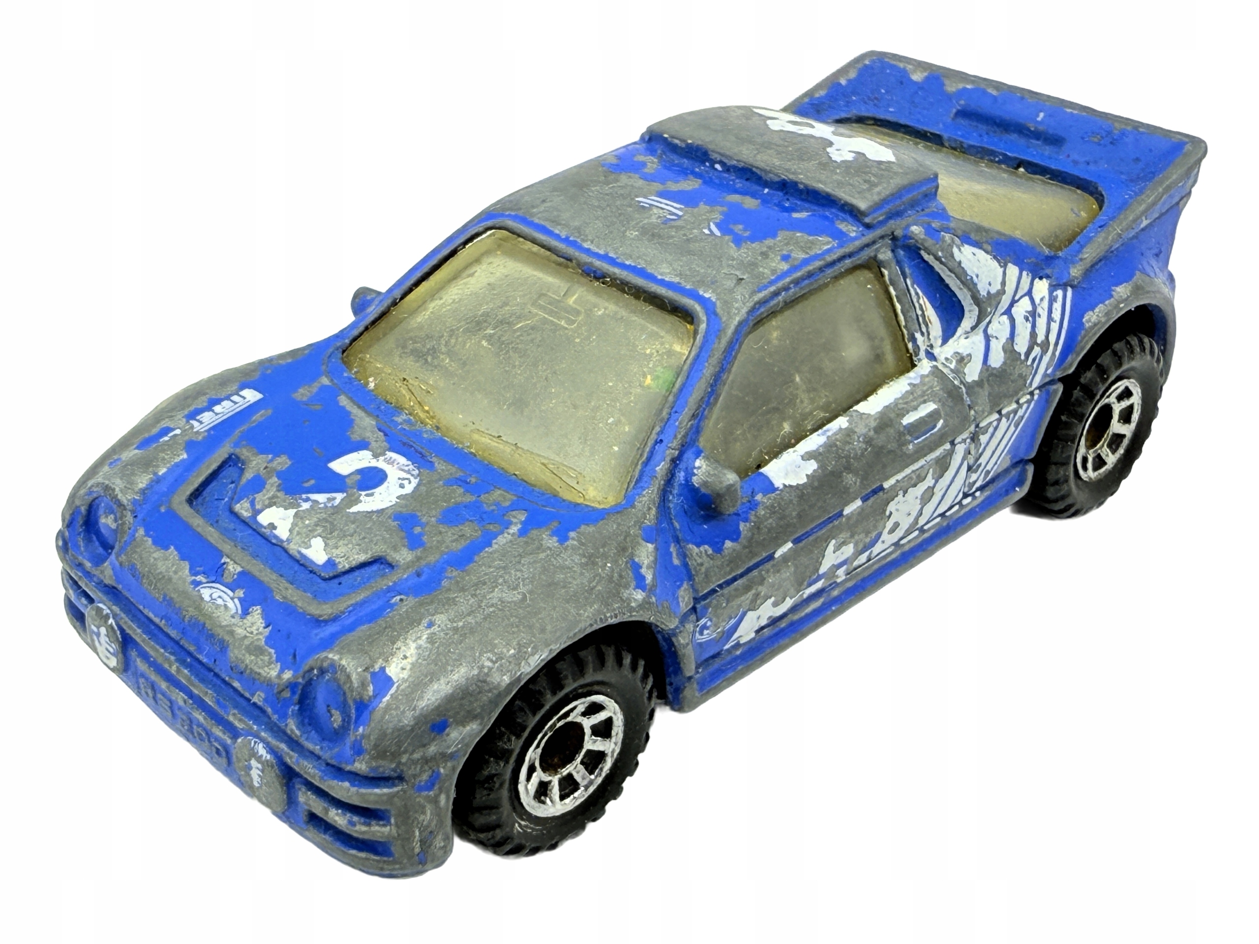 Эта пневматическая рессора Ford RS 200, изготовленная компанией Matchbox, привлекательна для коллекционеров благодаря прочной металлической конструкции и таким деталям, как вентиляционные отверстия на капоте и задний спойлер. Несмотря на видимые следы использования и сколы краски, он сохраняет свое очарование классической раллийной модели.