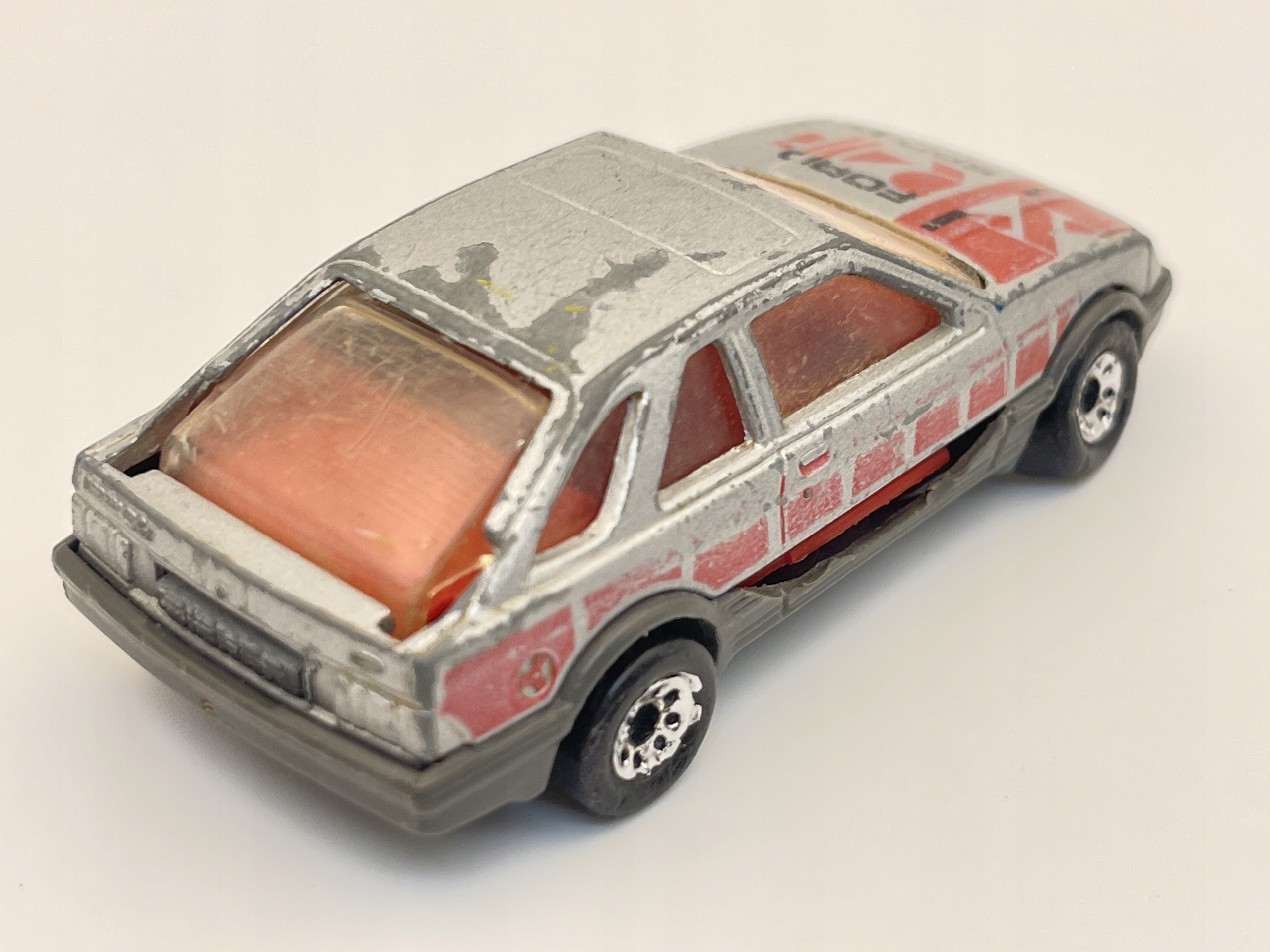 Этой весной представлен Ford Sierra XR4 производства компании Matchbox Toys LTD в Англии. Модель изготовлена из металла и окрашена в серебристый цвет с красными деталями и графикой Ford и Rally Sport. Оранжевые окна придают ему характер. Хотя на нем есть следы использования, такие как царапины и сколы краски, которые ухудшают его состояние до удовлетворительного, он по-прежнему привлекателен для коллекционеров благодаря своей прочности и исторической ценности.