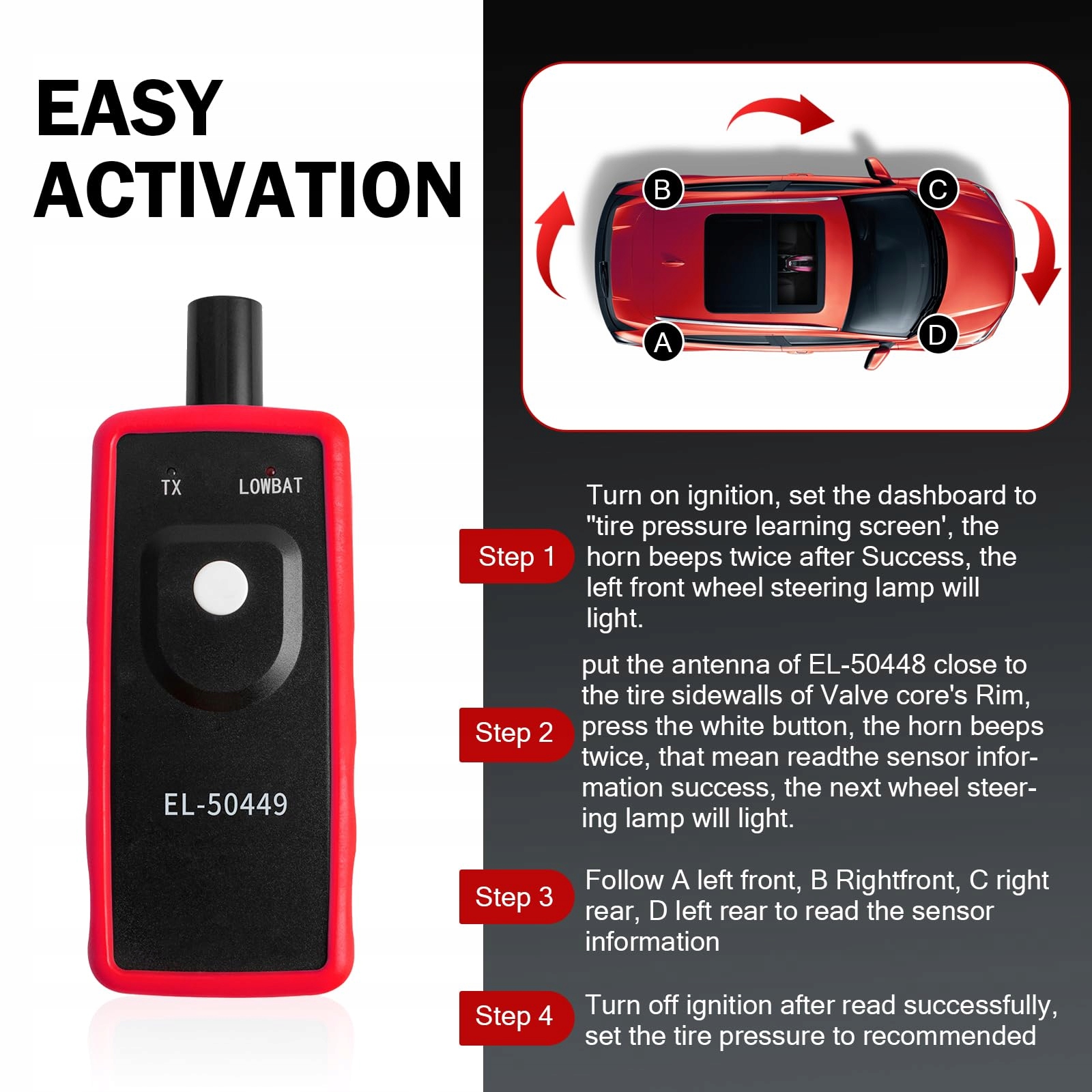 Профессиональный активатор и программатор датчиков TPMS EL-50449, предназначенных для автомобилей Ford. Незаменимый диагностический инструмент для быстрого и эффективного включения и программирования систем контроля давления в шинах (TPMS).