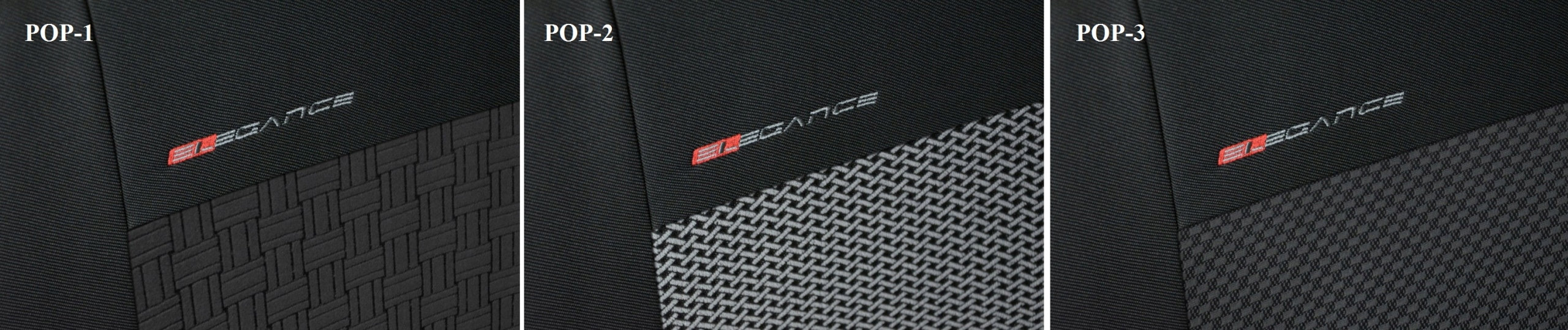 Чехлы ELEGANCE, изготовленные по индивидуальному заказу, изготовлены из высококачественного бархата (жаккард цвета ПОП-3) и прочной обивочной ткани в боковых частях чехла. Все материалы полностью ламинированы пенополиуретаном толщиной 3 мм, что предотвращает смещение чехлов относительно сидений. В местах, наиболее подверженных истиранию, использован трехслойный материал (дополнительно усиленный подкладкой).
