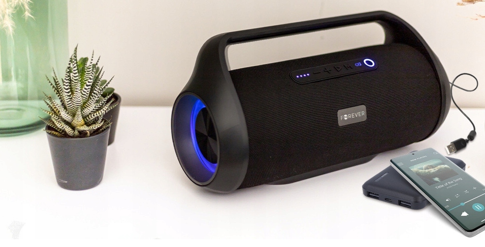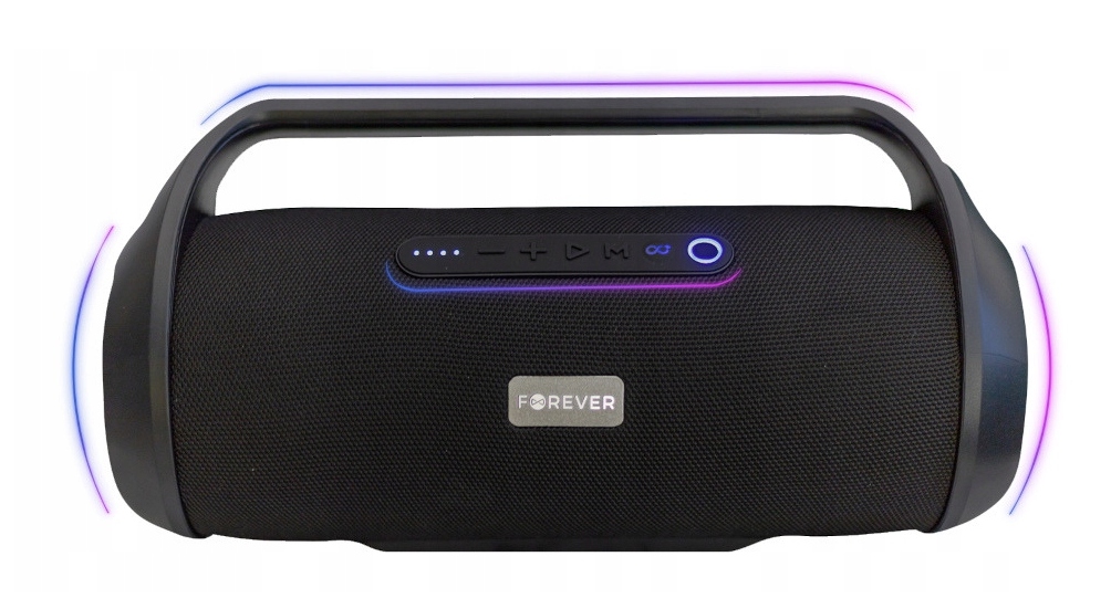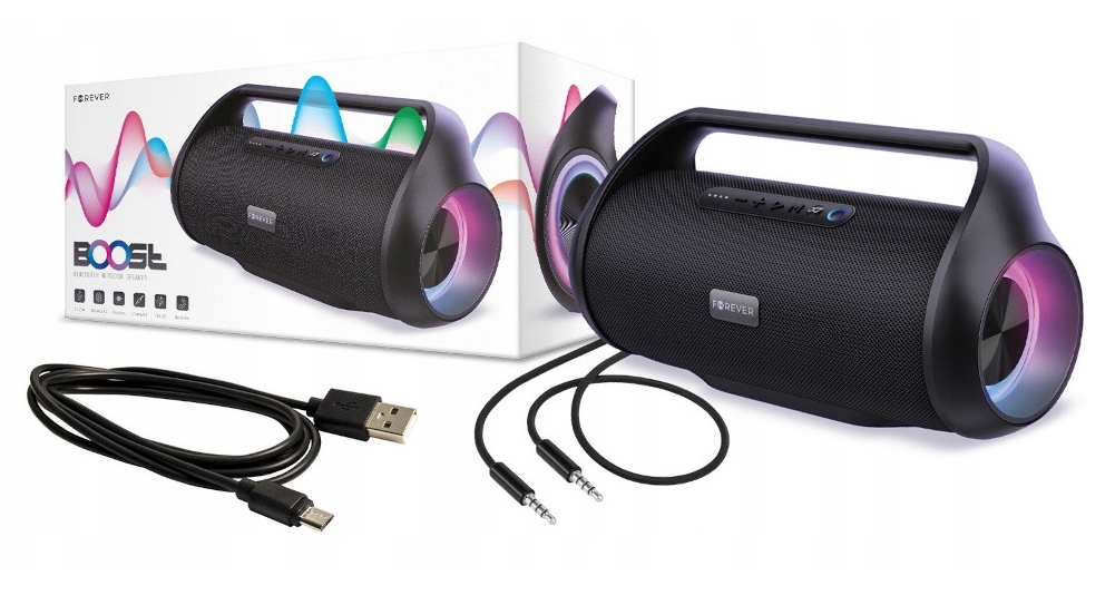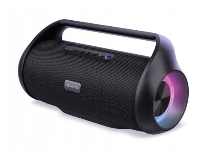 Boost от Forever был создан в форме культового бумбокса 1980-х и 1990-х годов. Корпусу придали современный шик и элегантность. Динамик достаточно большой, а удобная ручка позволяет легко перемещать оборудование с одного места на другое. Удивительные визуальные эффекты обеспечивает светодиодная подсветка, прыгающая в ритм музыки. Даже если вы организуете вечеринку дома, вы почувствуете себя как в модном клубе. Панель управления устройством интуитивно понятна и проста в использовании. Светодиодный индикатор показывает текущий уровень заряда батареи, поэтому отсутствие заряда вас никогда не удивит.