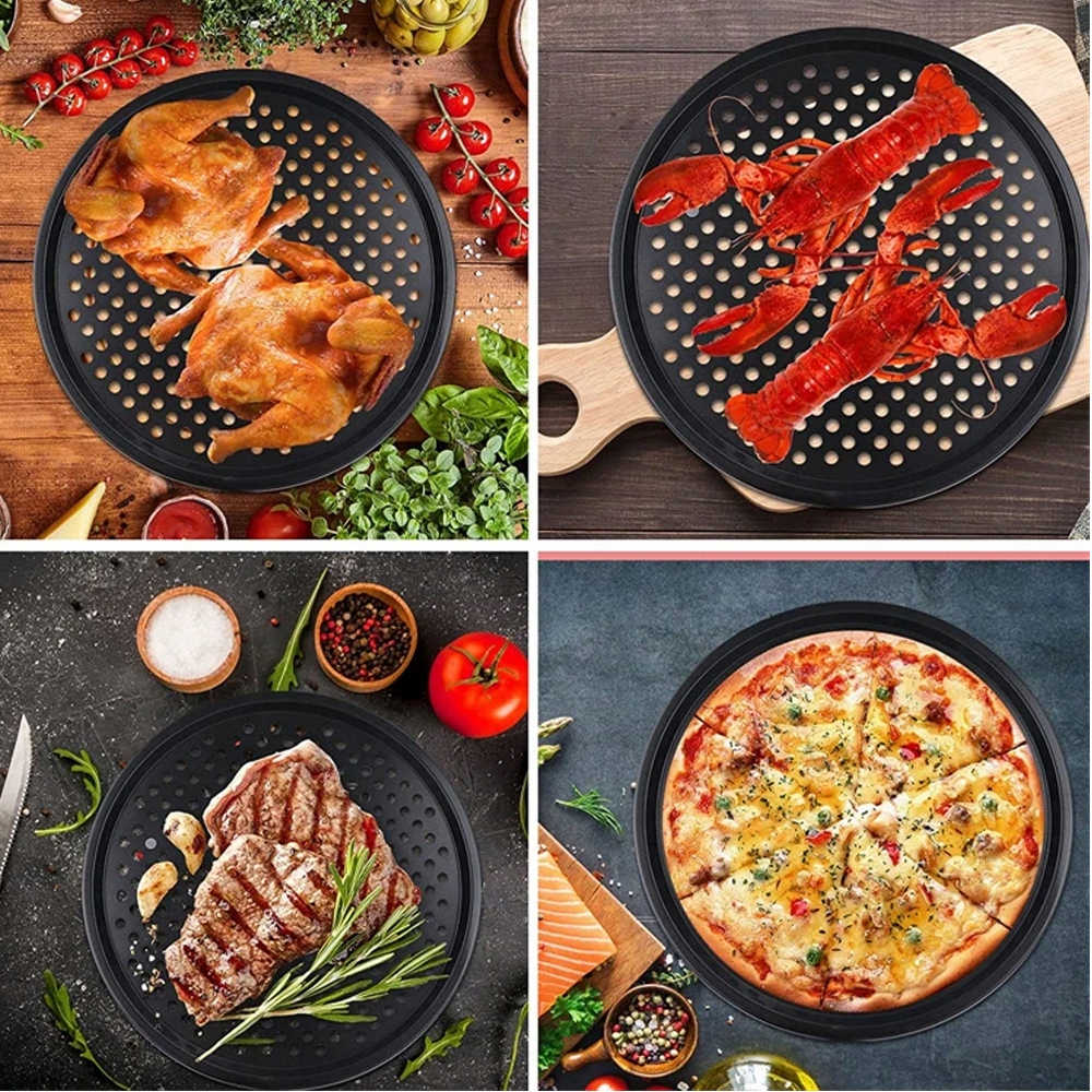 - Противень для пиццы с антипригарным покрытием с отверстиями и удобными ручками для удобного извлечения из духовки.