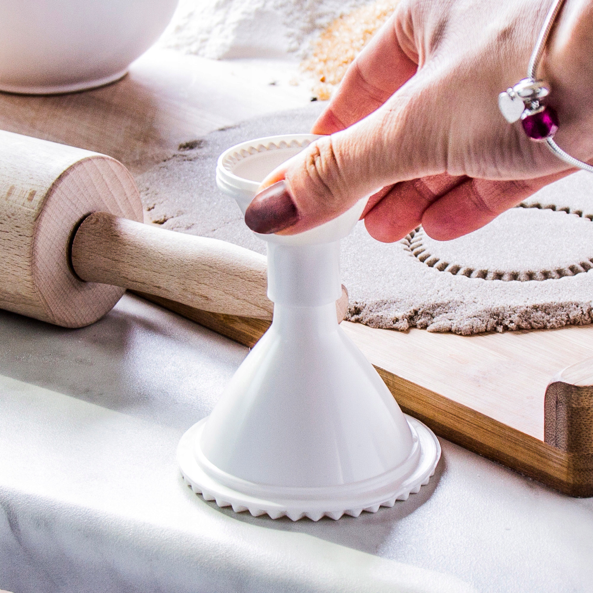 Специальная воронка с двумя функциями: форма для нарезки пельменей и пельменей, а в разложенном виде – обычная воронка.