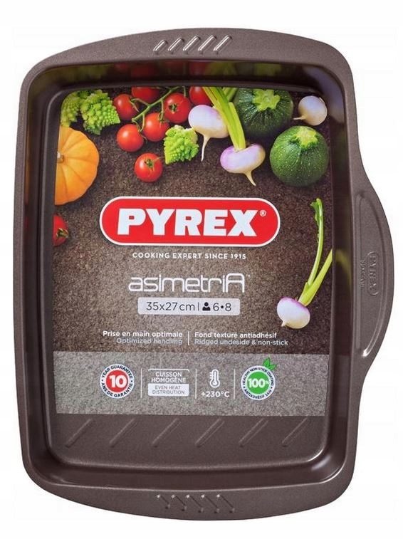 форма / лист азиметрии с размером 35 x 27 см, бренды Pyrex. Продукт изготовлен из углеродистой стали, покрытой непринимающим покрытием, которое является чрезвычайно прочным материалом, предотвращает предотвращение теста и распределяет тепло. Лист имеет 3 удобные ручки, которые позволяют вам сохранить плесень, вытянув из духовки. Форма может использоваться в духовке до 230 ° С. Первое использование следует промыть в теплой воде с добавлением моющего средства. Перед каждым использованием это должно быть слегка смазано. Чтобы расширить долговечность продукта, его не следует очищать проволокой и грубой губкой, не используйте металлические и острые инструменты.