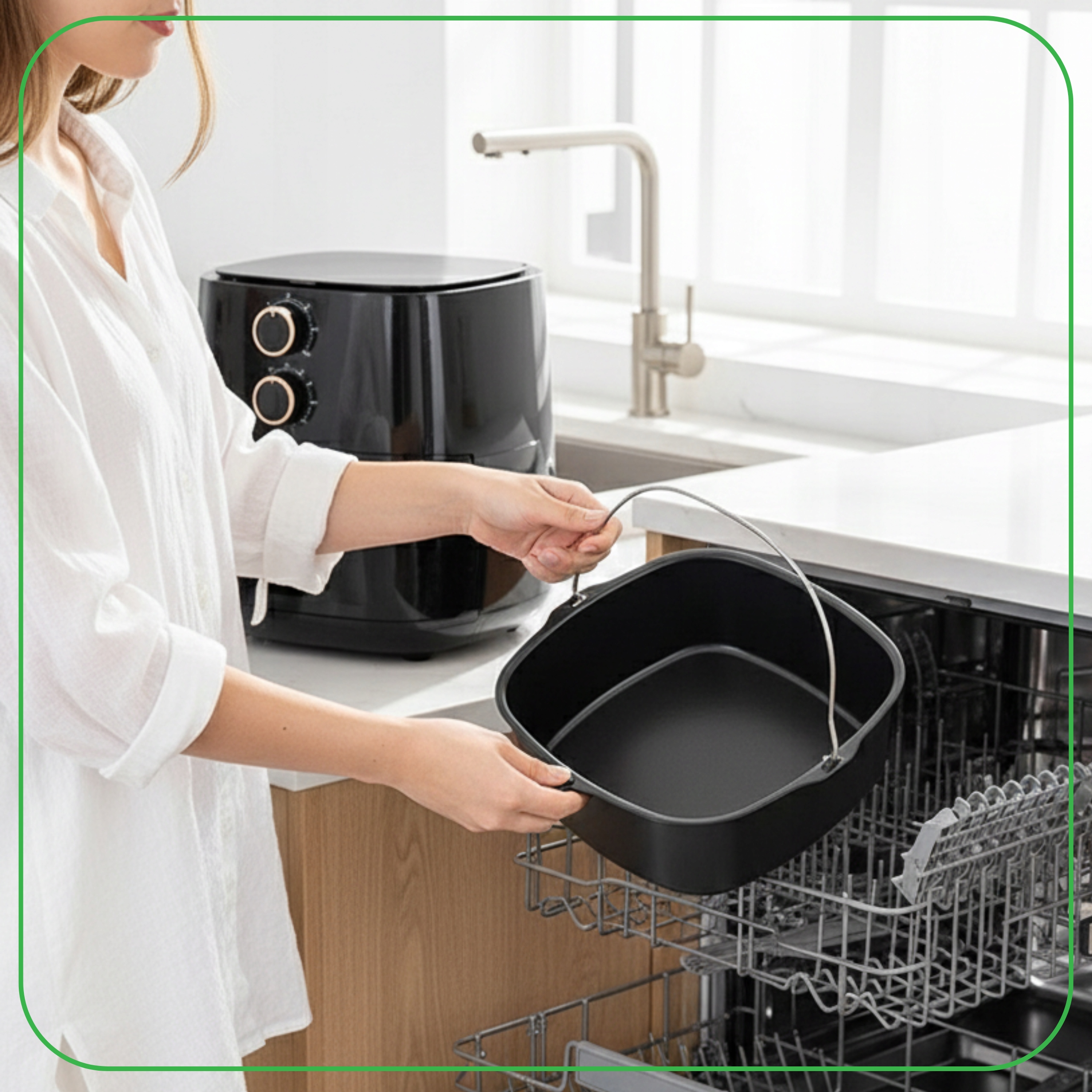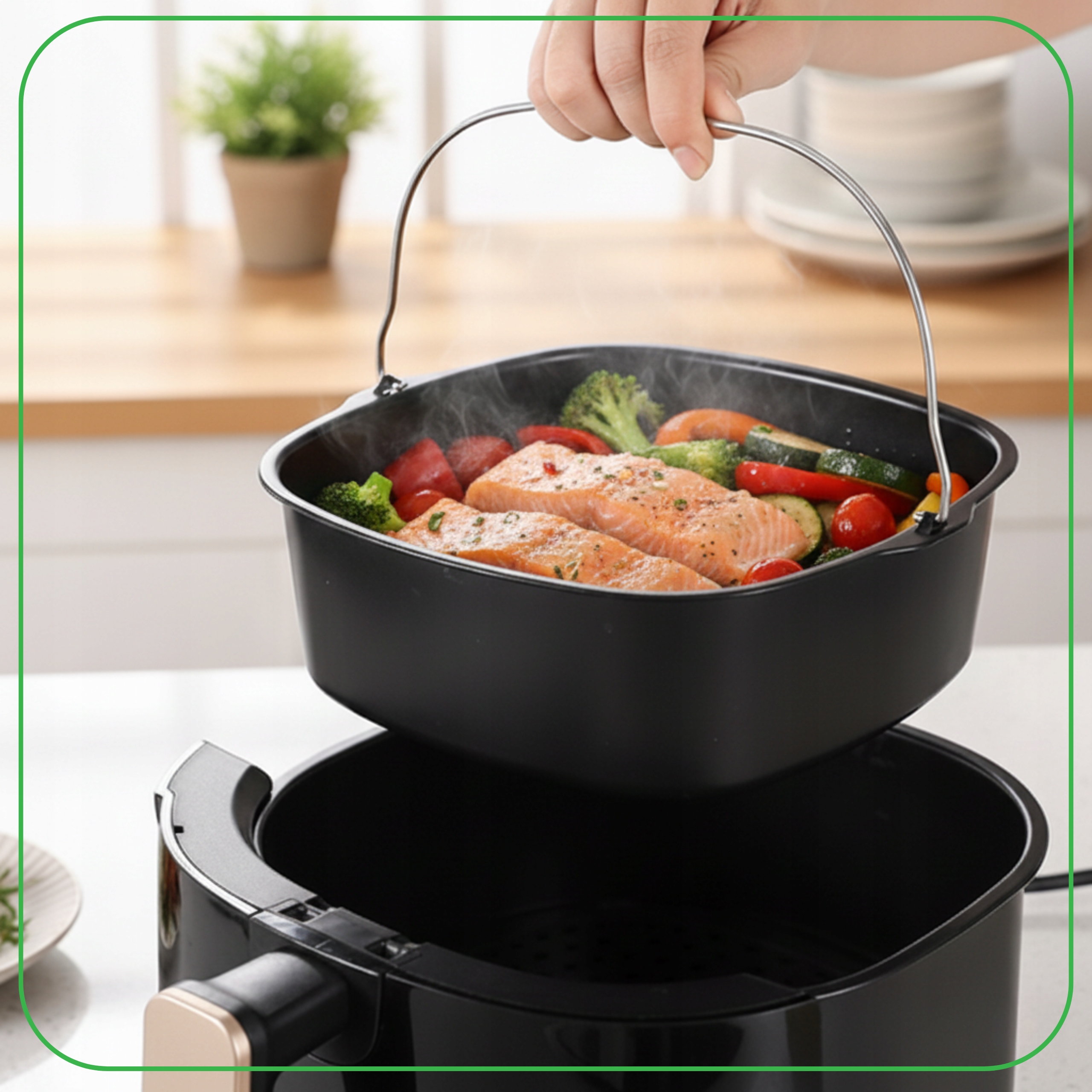 ➡️Для наилучшего соответствия рекомендуется, чтобы корзина для фритюрницы имела диаметр примерно 22,5 см, что позволит свободно размещать посуду и безопасно циркулировать горячему воздуху.